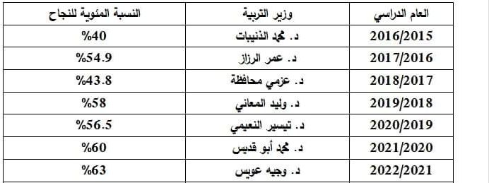 جدول رقم (1) وزراء التربية في آخر سبعة أعوام ونسب النجاح في التوجيهي في كل عام دراسي