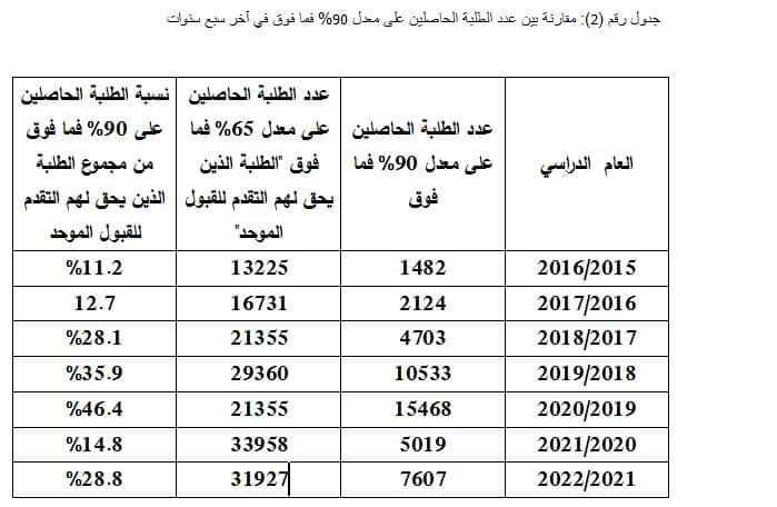 كما يكشف الجدول رقم (2) القفزة الكبيرة في أعداد الطلبة الحاصلين على معدلات مرتفعة ونسبتهم من مجموع الطلبة الذين يحق لهم التقدم للقبول الموحد (الطلبة الحاصلون على معدل 65% فما فوق).