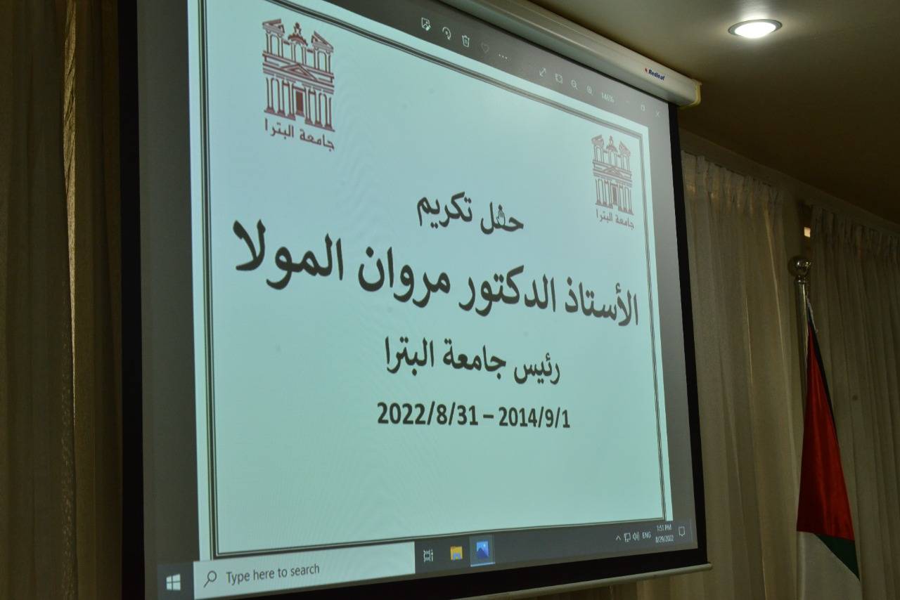 كرم رئيس مجلس أمناء جامعة البترا موسى شحادة والمستشار الأعلى للجامعة الدكتور عدنان بدران رئيس الجامعة الدكتور مروان المولا بمناسبة انتهاء عمله كرئيس لجامعة البترا، والذي عمل فيها لمدة ثماني سنوات متتالية وشارك في حفل التكريم أعضاء مجلس أمناء الجامعة ورئيس الجامعة الجديد الدكتور رامي عبد الرحيم وعمداء الكليات ونوابهم ورؤساء الأقسام الاكاديمية ومدراء الدوائر وعدد من أعضاء الهيئتين الأكاديمية والإدارية.