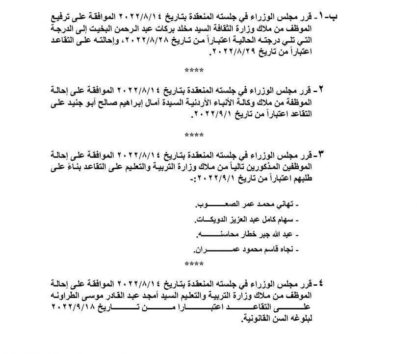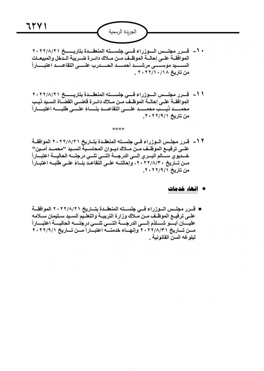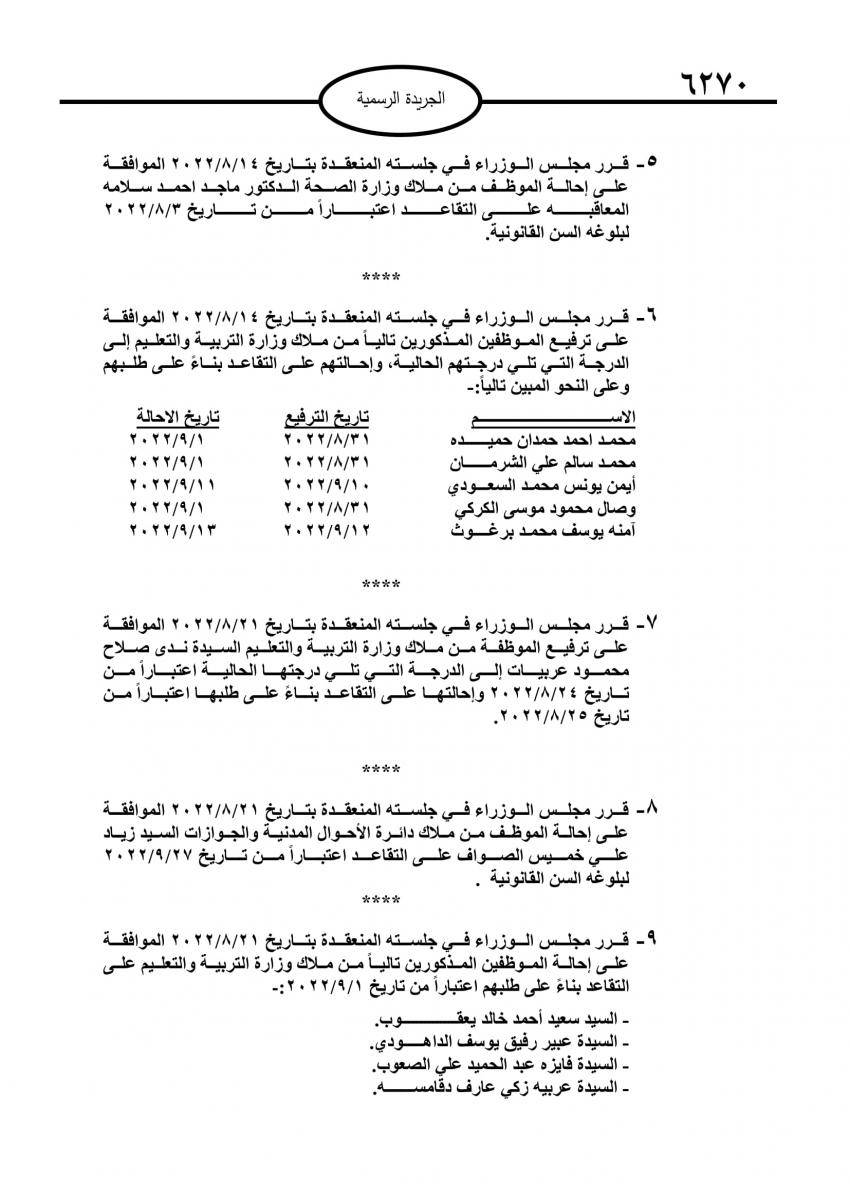 صدر في عدد الجريدة الرسمية اليوم الخميس قرارت مجلس الوزراء باحالة عدد من موظفي الدولة إلى التقاعد، وانهاء خدمات اخرين.