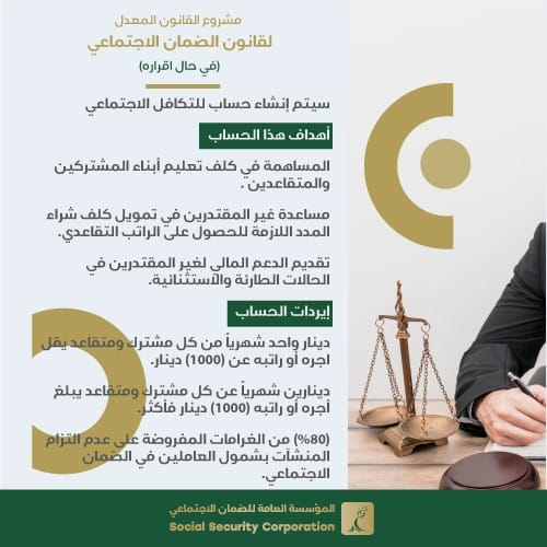 نشرت المؤسسة العامة للضمان الاجتماعي تفاصيل مشروع القانون المعدل لقانون الضمان الاجتماعي فيما يتعلق بـ إنشاء حساب للتكافل الاجتماعي :