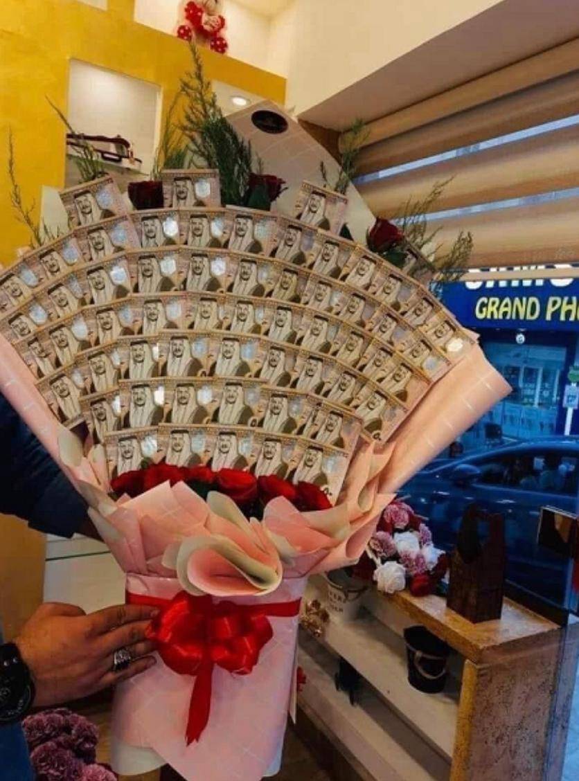 واظهرت الصورة باقة الورد المعلق بها مجموعة من الأوراق النقدية من فئة الخمسين دينار.