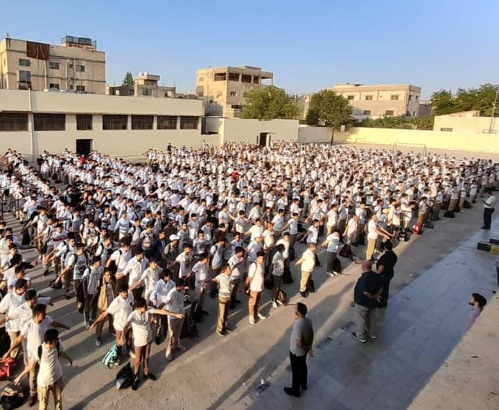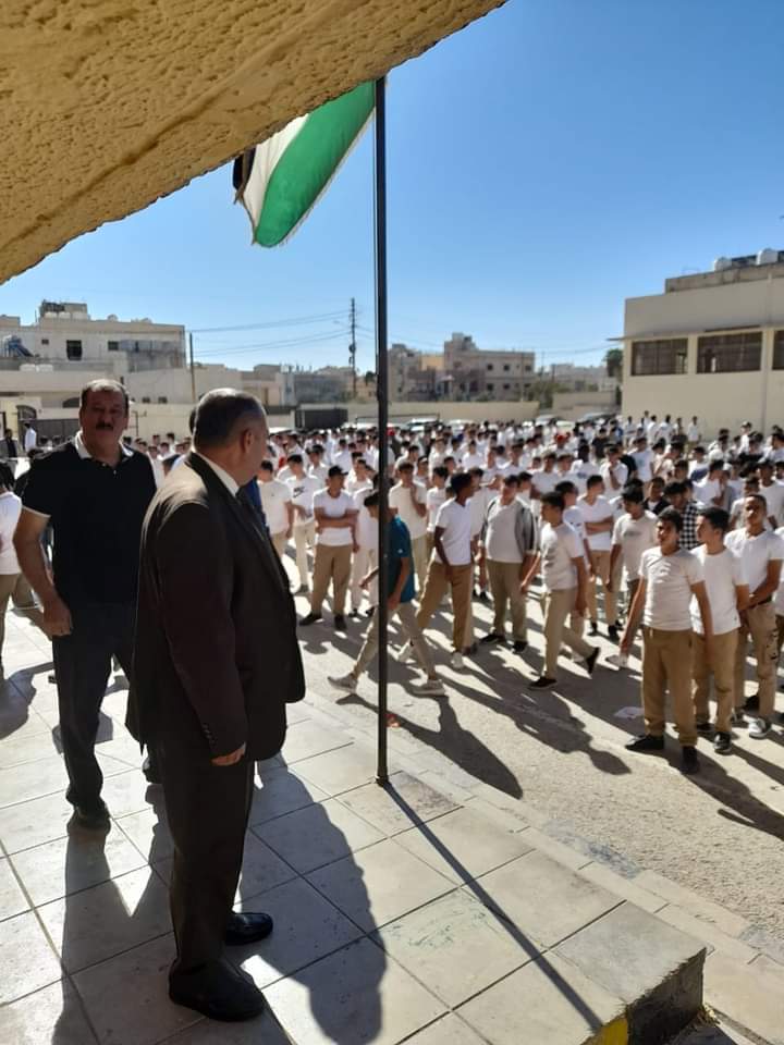 تفقد مدير التربية والتعليم للواء القويسمة رسمي حدرب الطابور الصباحي في مدرسة خريبة السوق الثانوية الأولى للبنين في صباح اليوم الاثنين يرافقه مدير الشؤون الإدارية الدكتور هشام القواسمة ورئيس قسم شؤون الموظفين مصطفى درويش.