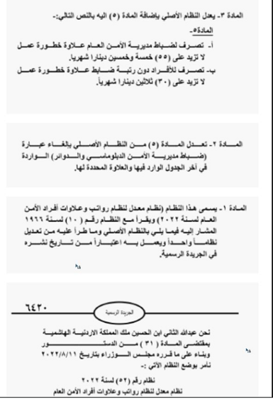 صدرت الإرادة الملكية بنظام معدل لنظام رواتب وعلاوات أفراد الأمن العام وذلك بعد نشره في الجريدة الرسمية اليوم الخميس.