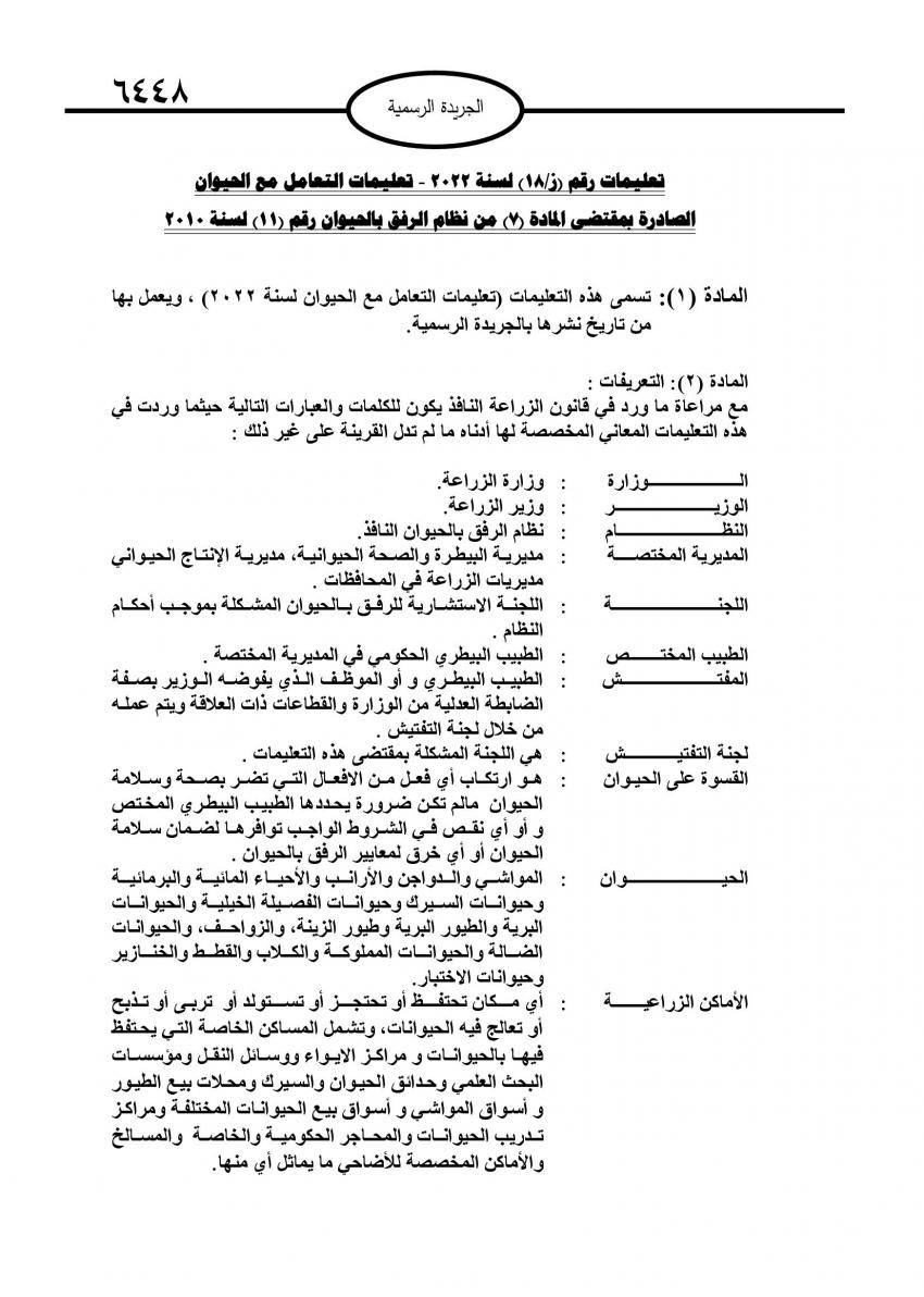 صدر في عدد الجريدة الرسمية الخميس، تعليمات التعامل مع الحيوان.