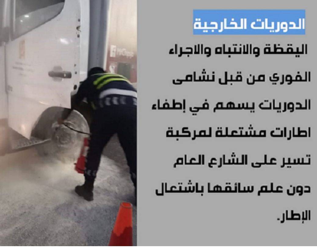تعاملت إحدى الدوريات الخارجية مساء اليوم السبت مع حالة اشتعال أحد الإطارات الأمامية لمركبة كانت تسير على الطريق العام دون ملاحظة ذلك من قبل سائقها.