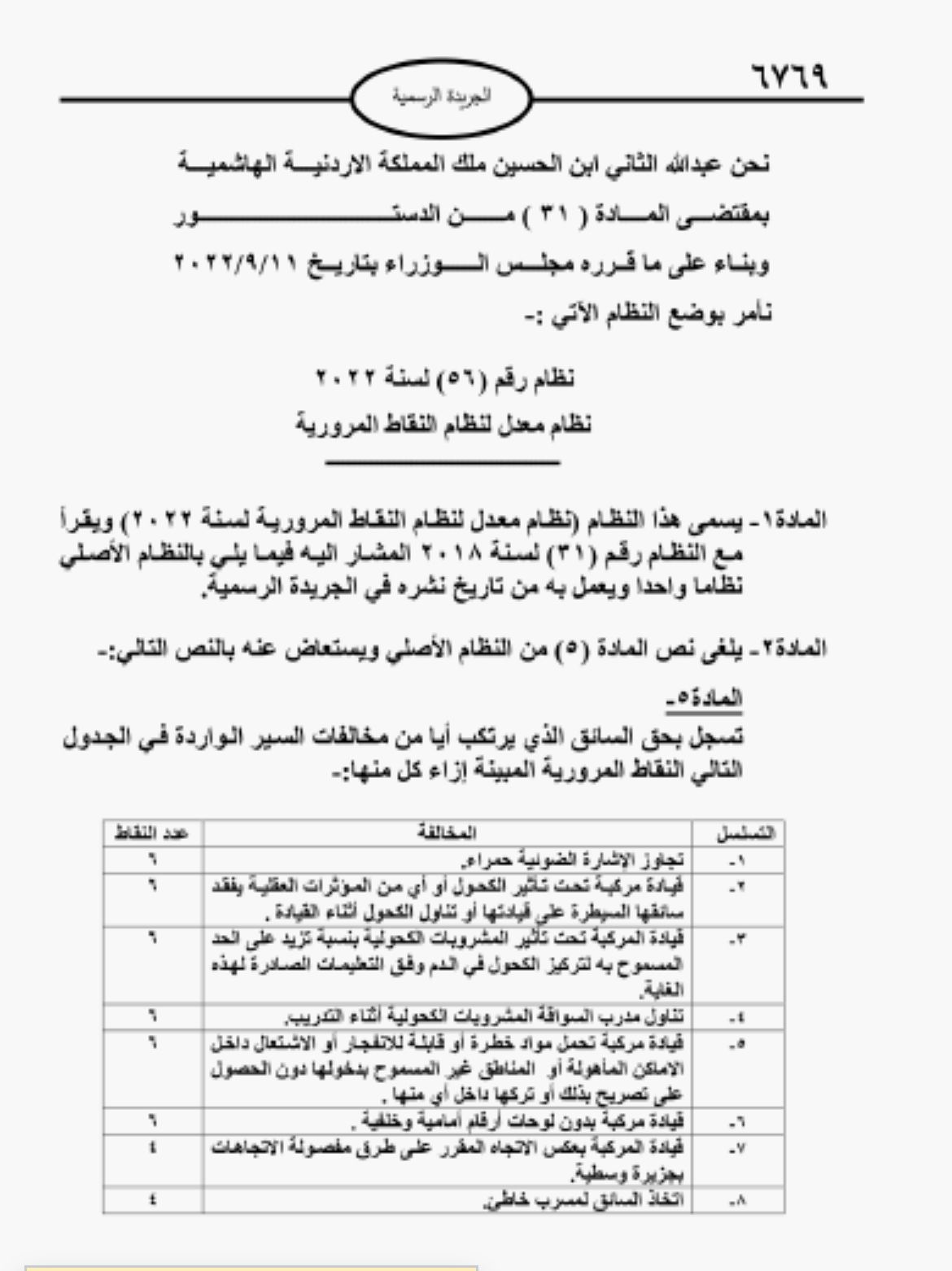 أمر الملك عبدالله الثاني ابن الحسين بوضع النظام المعدل لنظام النقاط المرورية لسنة 2022 قيد التنفيذ.