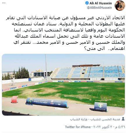 وبين الأمير علي في إدراج له عبر صفحته الشخصية على موقع التواصل الاجتماعي " تويتر"، أن الحكومة ستقوم على إعادة "إصلاح" ستاد عمان الدولي لاستضافة اللقاء الودي الذي يجمع النشامى والمنتخب الاسباني، "انما الاستادات عامة و تلك التى تحمل اسماء الملك عبدالله والملك حسين و الامير حسن و الامير محمد… تفتقر اي اهتمام.. الى متى؟".