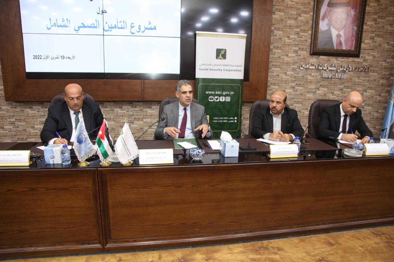 من ناحيته ،ثمن المهندس ماجد سميرات رئيس الاتحاد الاردني لشركات التأمين هذه الخطوة من الضمان الاجتماعي بالاستجابة لطلب القطاع للاطلاع على حيثيات هذا المشروع ومعرفة الدور المرتقب للشركات فيه ، حيث بين أن الاتحاد هو بيت التأمين الاردني والذي يسعى دائما لعقد لقاءات مشتركة بين ممثلي قطاع التأمين وكافة الجهات ذات العلاقة بالتأمين واللقاء اليوم جاء نظراً لاهمية دور شركات التأمين بتوفير التأمين الصحي الذي تمارسه (22) شركة تأمين والتي تمتلك خبرات واسعة حول تغطية التأمين الصحي ، كما أكد المهندس سميرات بأن شركات التأمين مع فكرة التأمين الصحي الشامل وذلك لتحقيق رؤية جلالة الملك عبدالله الثاني في التحديث الاقتصادي بالوصول إلى مظلة متكاملة للتأمين الصحي الشامل.