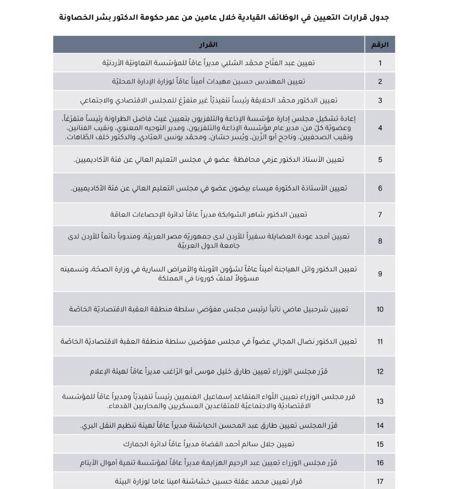 كشفت نتائج تقرير مركز الحياة – راصد لمراقبة أداء حكومة الدكتور بشر الخصاونة بعد عامين على تشكيلها، أن قرارات التعيين في المناصب القيادية الصادرة عن مجلس الوزراء بلغت 69 قرارًا خلال عامين.