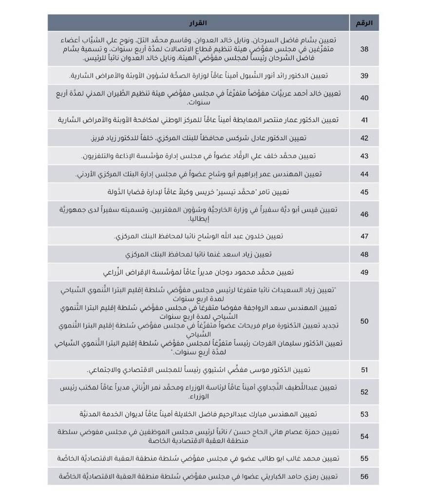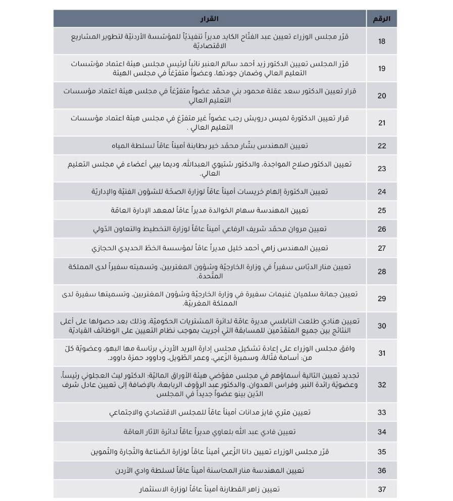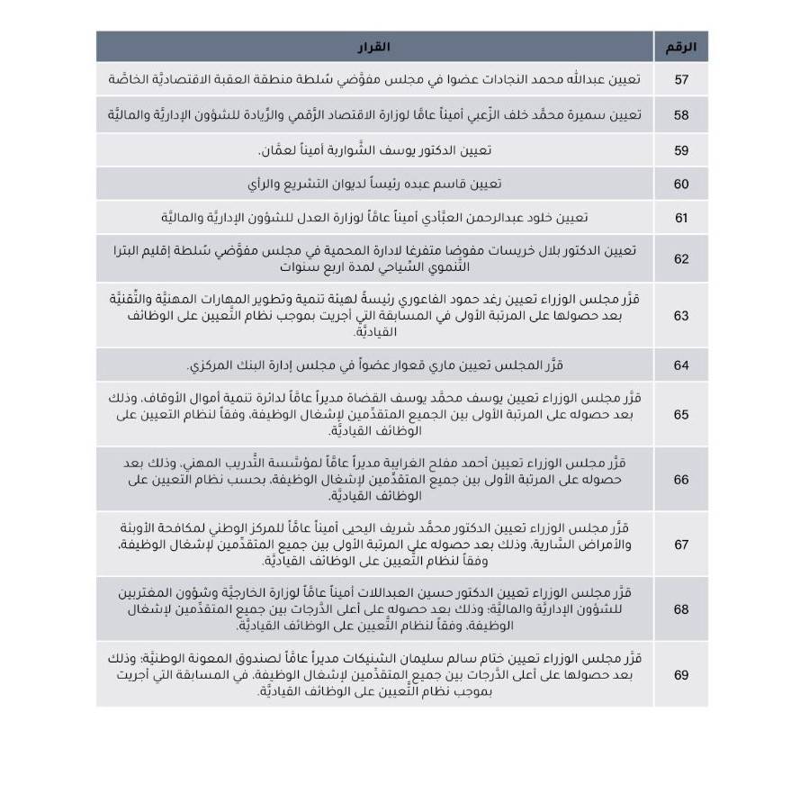 وبحسب النتائج أشارت أنه تم تعيين 90 شخصاً بموجب هذه القرارات، علماً بأن التعيينات التي تم اعتمادها هي التعيينات في المناصب القيادية، حيث تم تعيين 18 أمين عام، و16 شخصاً بموقع مدير عام، وتم تشكيل وإعادة تشكيل مجالس مفوضين وإدارة حيث تم تعيين 23 شخصاً فيها، وبمنصب رئيس تنفيذي أو رئيس مجلس تم تعيين 6 أشخاص، و4 بموقع سفير علماً بأنهم كانوا يشغلون مناصب خارج ملاك وزارة الخارجية قبيل تعيينهم، وتم تعيين محافظاً للبنك المركزي، وأميناً لعمان، ووكيلاً عاماً لإدارة قضايا الدولة، و20 شخصاً تم تعيينهم أعضاءً في مجالس إدارة ومفوضية وهيئات مستقلة.