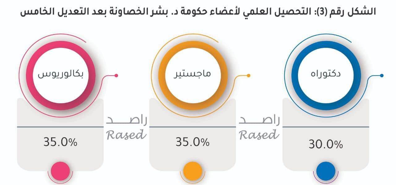 وبخصوص الفئة العمرية لتشكيلة الحكومة بعد التعديل الخامس بلغ معدل أعمار حكومة الخصاونة 58 عاماً، حيث بلغ أكبر الوزراء سناً 75 عاماً، وأقل الوزراء سناً 43 عاماً، أما بما يتعلق بالخلفيات الأكاديمية لتشكيل الخصاونة بعد التعديل الخامس فقد تبين أن عدد الوزراء الذين يحملون درجة الدكتوراة 8 وزراء فيما بلغ عدد الذين يحملون درجة الماجستير 9 وزراء، وعدد الذين يحملون درجة البكالوريوس 9 وزراء
