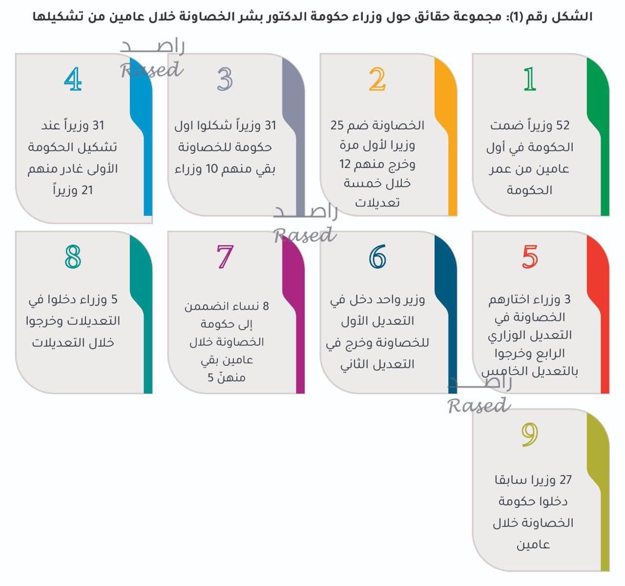 وبتحليل الوزراء بعد التعديل الخامس يتبين أن 10 وزراء ممن كانوا في التشكيل الأول لحكومة الدكتور بشر الخصاونة حافظوا على حقائبهم، فيما غادر 21 وزيراً كانوا ضمن التشكيل الأول لحكومة الخصاونة، وبينت النتائج أن 25 وزيراً تم توزيرهم لأول مرة في عهد الخصاونة غادر منهم 12 وزيراً