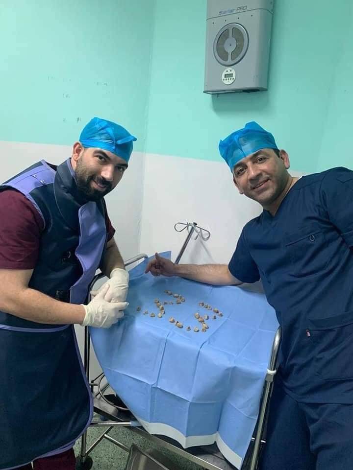 من جهته، قال أخصائي جراحة الكلى والمسالك البولية الدكتور مصطفى شلاه إن فريق جراحة الكلى والمسالك البولية تمكن من إزالة 33 حصوة خلال ساعتين وتمت معالجة الانسداد واستخراج الحصى.