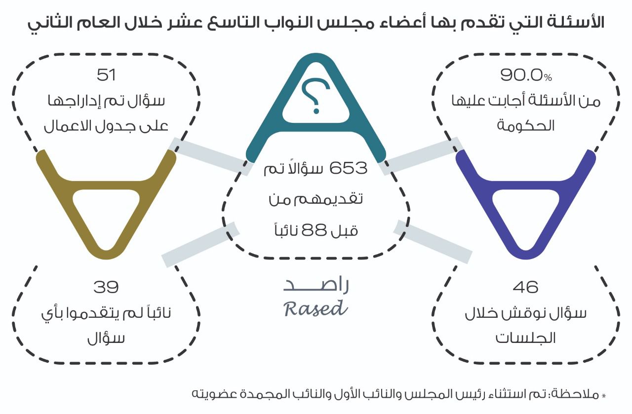 وتبين التحليلات أن النائب خليل عطية الأعلى تقديماً للأسئلة النيابية بـ 49 سؤالاً، تلاه النائب فريد حداد بـ 46 سؤالاً، ثم النائب سليمان أبو يحيى بـ 44 سؤالاً، والنائب صفاء المومني بـ41 سؤالاً، ثم النائب صالح العرموطي بـ 39 سؤالاً، والنائب زينب البدول بـ 26 سؤالاً.