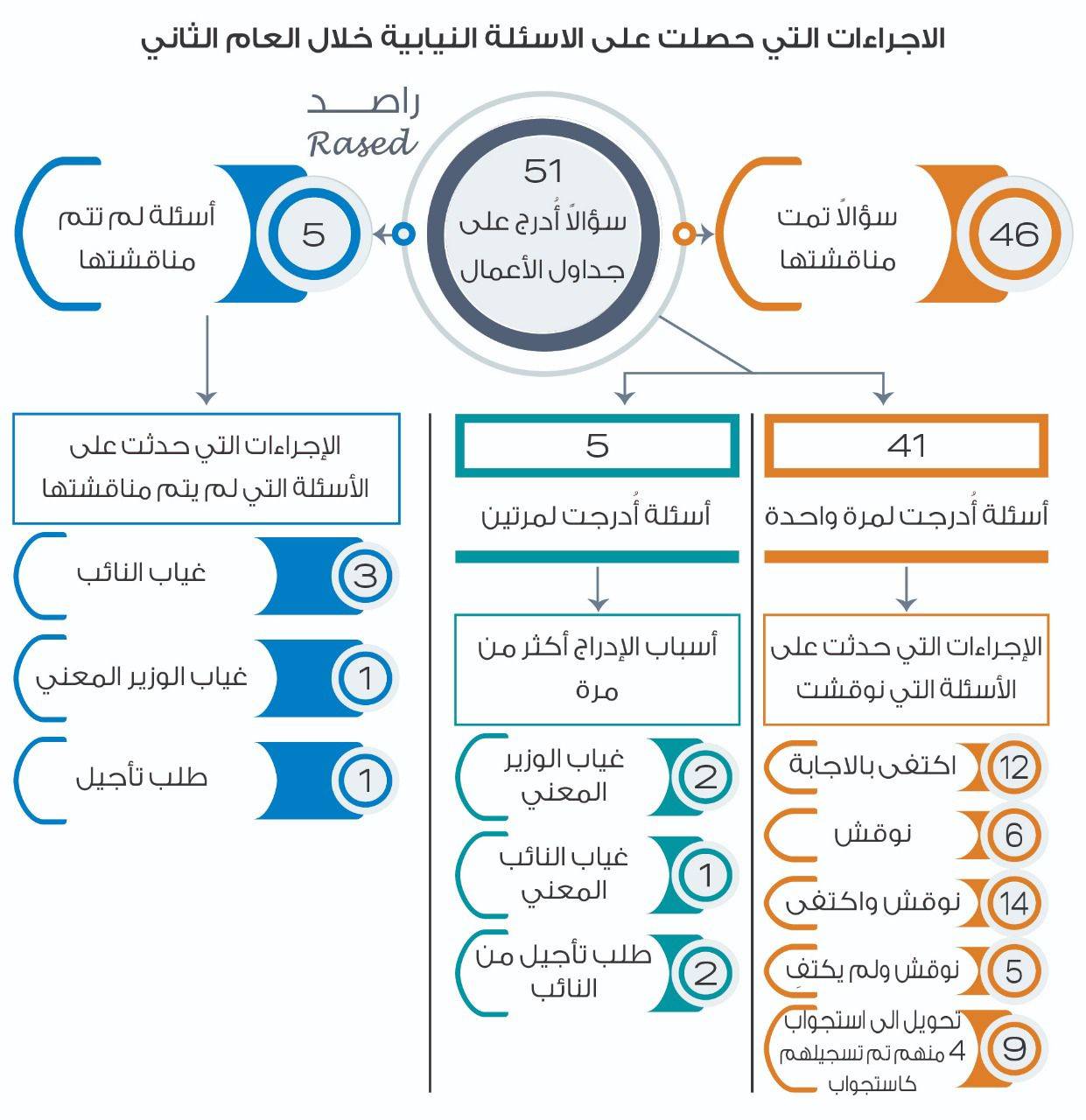 وقدم مجلس النواب في عامه الثاني 653 سؤالاً نيابياً تقدم بهم 88 برلماني وبرلمانياً، وأجيب على 90% منهم، فيما لم يتقدم ما مجموعه 39 نائباً بأسئلة خلال العام الثاني ولغاية تاريخ 30/10/2022، وتبين التحليلات أنه تم إدراج 56 سؤالاً على جداول أعمال الجلسات الرقابية، وخلال مناقشات الأسئلة النيابية تم طلب تحويل 9 أسئلة إلى استجواب من قبل البرلمانيين والبرلمانيات مقدمي الأسئلة إلا أنه وعند مراجعة ما تم تسجيله لدى الأمانة العامة تبين تسجيل 4 أسئلة من أصل 9 أسئلة، قال أصحابها أنهم يريدون تحويلها إلى استجوابات وسجلت لدى الأمانة العامة.
