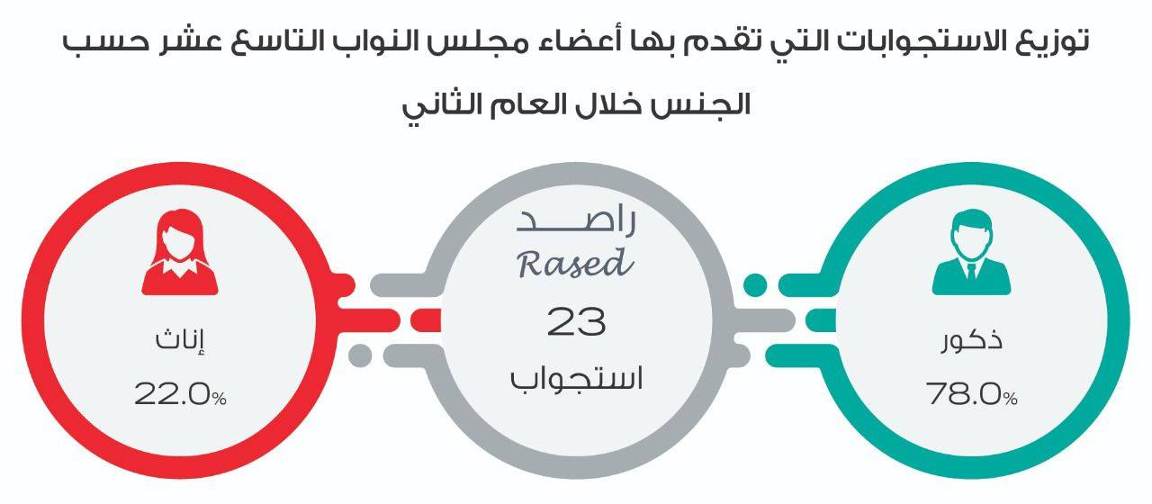 وبيّن التقرير أن تعداد المداخلات التي قدمها البرلمانيات والبرلمانيين بلغت 4105 مداخلة خلال العام الثاني يزيادة بلغت 1113 مداخلة عن العام الأول، حيث كان مجموع المداخلات خلال العام الأول 2922 مداخلة، وبالمقارنة مع تعداد المداخلات مع العام الثاني لمجلس النواب الثامن عشر يتبين أن عدد المداخلات في العام الثاني للمجلس التاسع عشر بلغ ضعف العام الثاني للمجلس الثامن عشر حيث كان مجموع المداخلات للعام الثاني في المجلس الثامن عشر 2124 مداخلة.