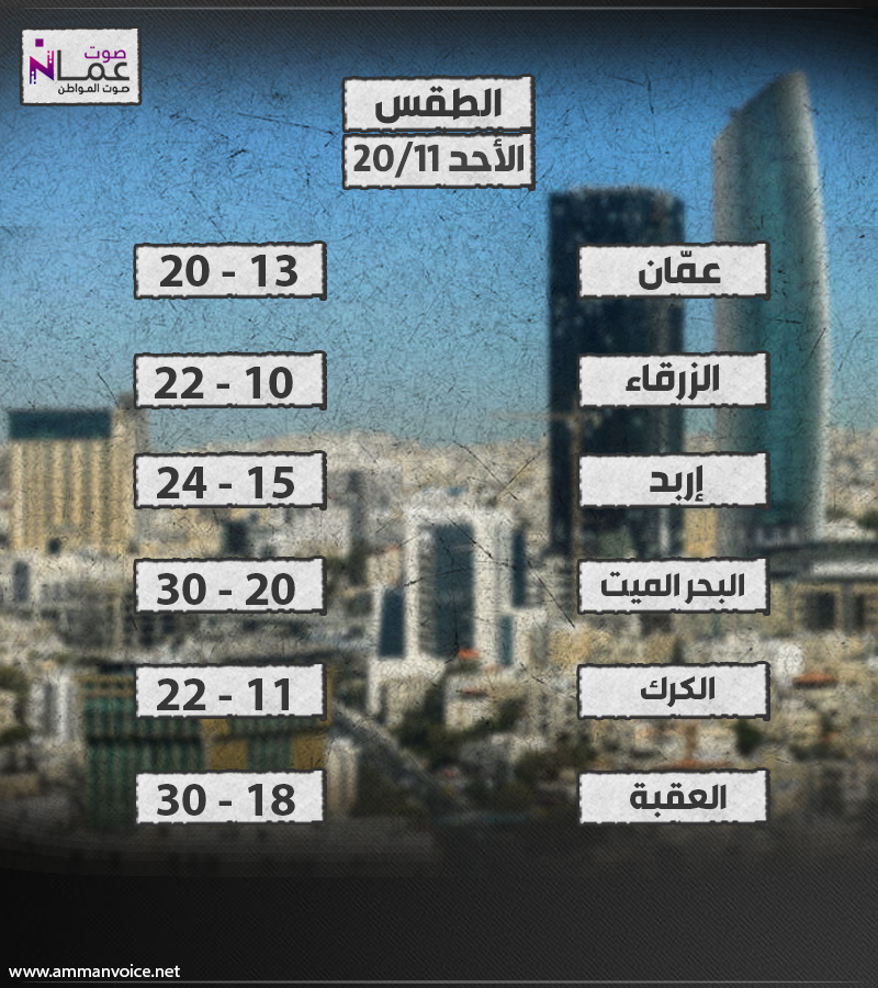 وبحسب الأرصاد الجوية، تكون الأجواء معتدلة في الأغوار والبحر الميت والعقبة، مع ظهور بعض الغيوم على ارتفاعات منخفضة في الأجزاء الجنوبية من المملكة والرياح جنوبية شرقية معتدلة السرعة تنشط على فترات.