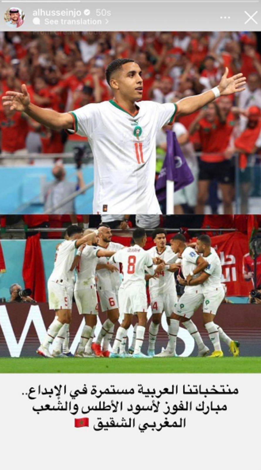 ونشر ولي العهد صورة للمنتخب المغربي عبر حسابه في موقع تبادل الصور انستغرام، علق عليها بقوله: منتخباتنا العربية مستمرة في الابداع ... مبارك الفوز لأسود الاطلس والشعب المغربي الشقيق .