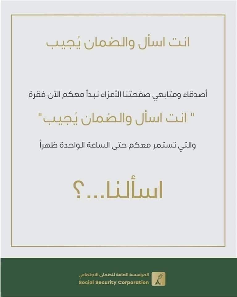 وأكد العكروش أن خدمة "أنت اسأل والضمان يجيب" تبدأ كل يوم اثنين وأربعاء من كل اسبوع من الساعة 11 صباحا وحتى الواحدة ظهرا، ويشرف عليها مجموعة من الموظفين الأكفأ المؤهلين للإجابة عن استفسارات المواطنين المتعلقة بالضمان والتأمينات، ومتابعة شؤون المشتركين في كل ما يخص الإدخار والتقاعد، والسلف، والتأمينات، والمميزات