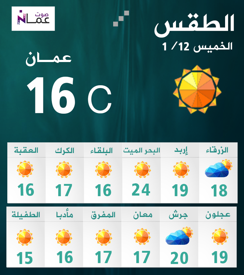 وتتراوح درجات الحرارة العظمى والصغرى في شرق عمان اليوم ما بين 19 - 11 درجة مئوية، غرب عمان 17 - 11، المرتفعات الشمالية 16 - 8، مرتفعات الشراة 17 - 6، مناطق البادية 21 - 8، مناطق السهول 20- 10، الأغوار الشمالية 24- 15، الأغوار الجنوبية 27 - 17، البحر الميت 26 - 16، وفي خليج العقبة 27 - 16 درجة مئوية.