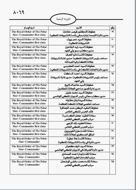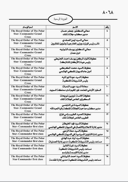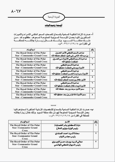 وصدرت الإرداة الملكية السامية بالسماح للشخصيات الأردينة المذكورة اسماؤهم تالياً، بحمل الاوسمة السودية الممنوحة لهم من ملك مملكة السويد، وذلك خلال زيارته المملكة في الفترة من 14/ - 17 / 11 / 2022.