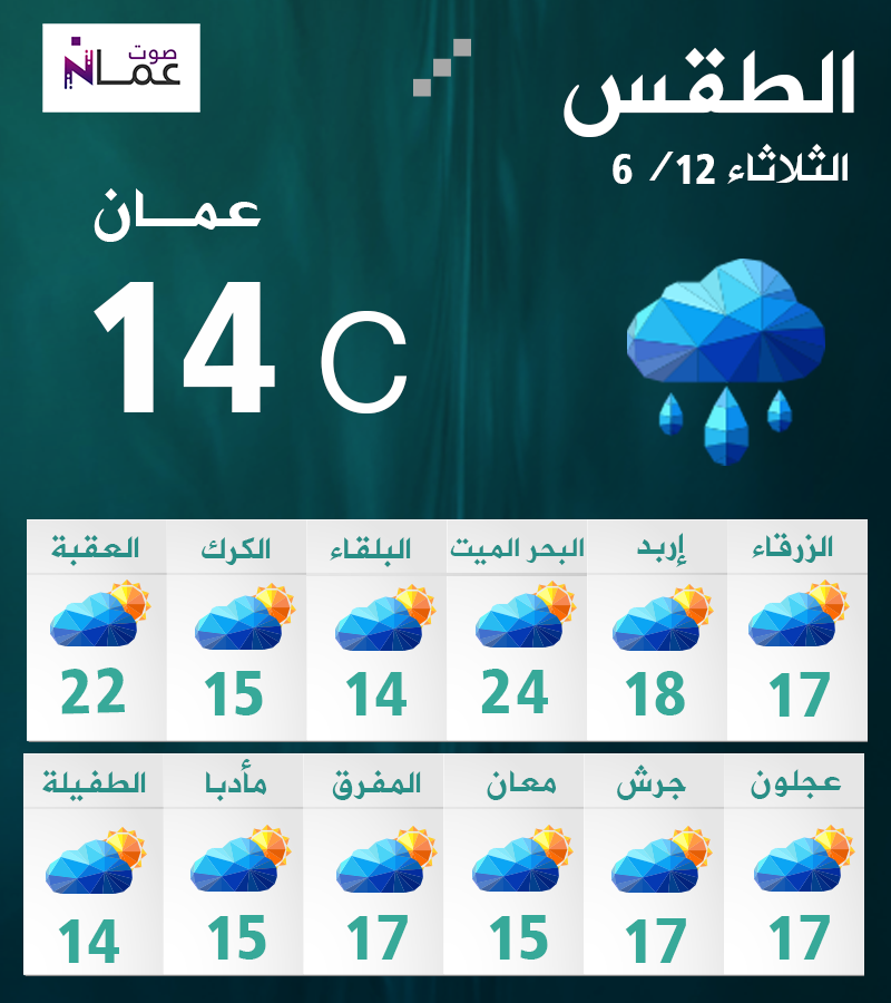 يطرأ انخفاض طفيف على درجات الحرارة، اليوم الثلاثاء، ويكون الطقس لطيف في أغلب المناطق، ومعتدل في الأغوار والبحر الميت والعقبة، مع ظهور الغيوم على ارتفاعات منخفضة.