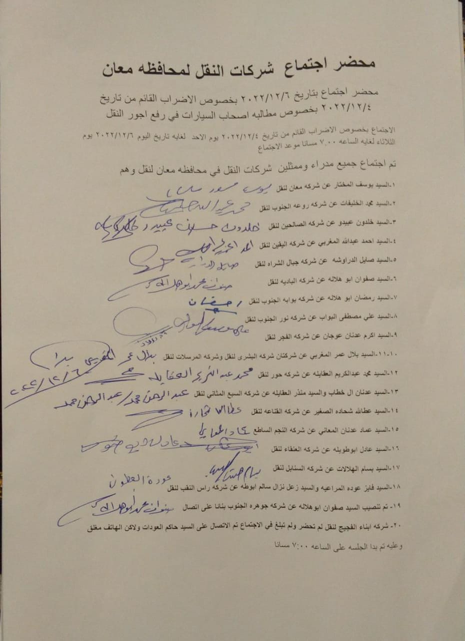 اجتمع مدراء وممثلي شركات النقل في محافظة معان اليوم، لمناقشة إضراب السائقين ومطالبهم برفع أجور النقل.