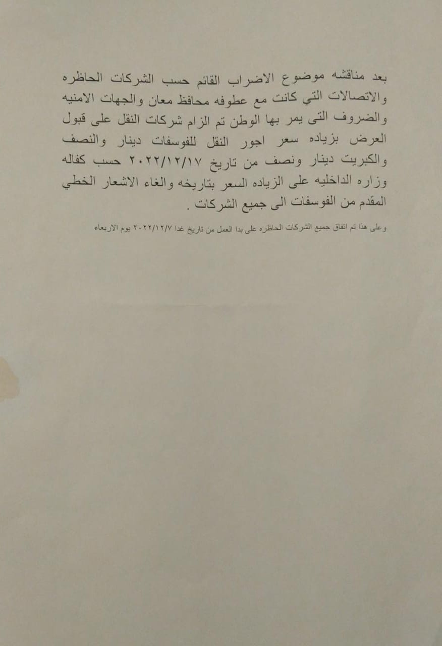 وبناءًا على الاتفاق الذي تم التوصل إليه ، وبجهود الجهات المعنية كافة والأجهزة الأمنية ، تم إنهاء الإضراب في جميع محافظات المملكة، وإلزام شركات النقل على قبول زيادة الأجر اعتبارًا من تاريخ 17 من الشهر الجاري وبحسب كفالة وزارة الداخلية على الزيادة وإلغاء الاشعار الخطي المقدم من الفوسفات إلى جميع الشركات.