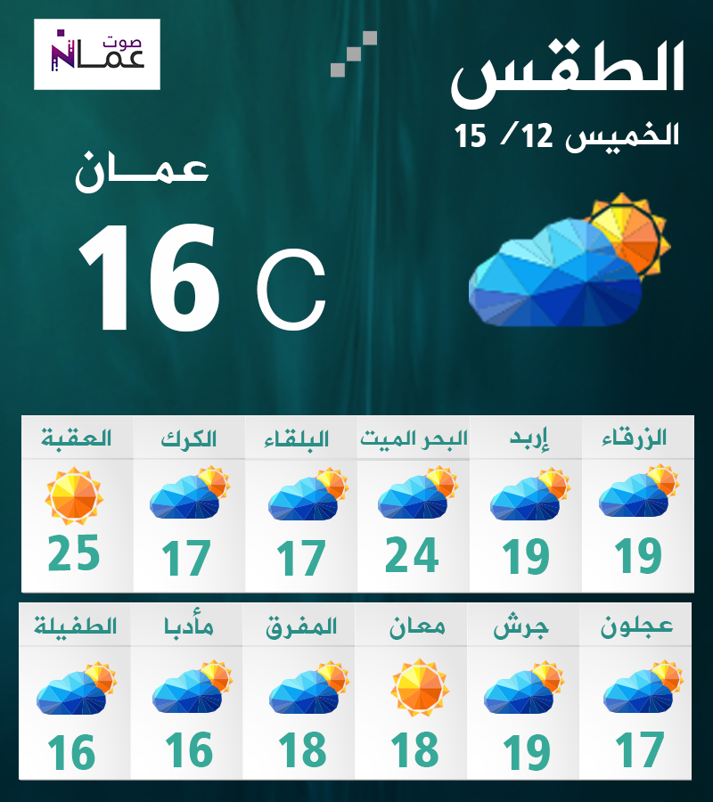تكون الأجواء لطيفة الحرارة، اليوم الخميس، في أغلب مناطق المملكة، ومعتدلة في الأغوار والبحر الميت والعقبة، مع ظهور الغيوم على ارتفاعات مختلفة، وتكون الرياح شمالية غربية معتدلة السرعة.