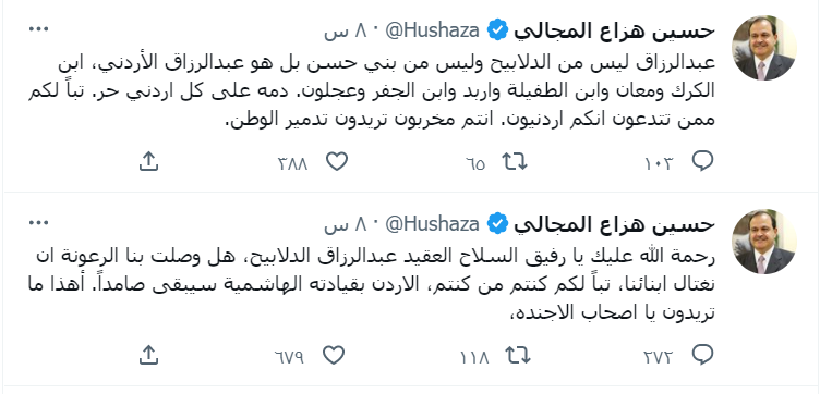 وتابع في تغريدة ثانية له: "عبدالرزاق ليس من الدلابيح وليس من بني حسن بل هو عبدالرزاق الأردني، ابن الكرك ومعان وابن الطفيلة واربد وابن الجفر وعجلون. دمه على كل اردني حر، تباً لكم ممن تتدعون انكم أردنيون. انتم مخربون تريدون تدمير الوطن".