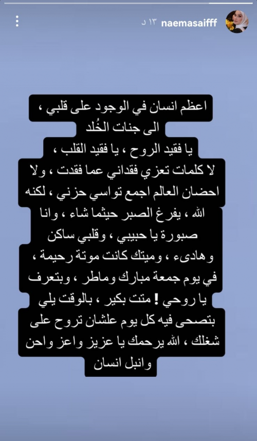 وقالت ابنته عبر خاصية الستوري على حسابها على موقع تبادل الصور "انستغرام": "أعظم إنسان في الوجود على قلبي، إلى جنات الخلد يا فقيد الروح، يا فقيد القلب، لا كلمات تعزي فقداني عما فقدت، ولا أحضان العالم أجمع تواسي حزني، لكنه الله، يفرغ الصبر حيثما شاء، وأنا صبورة يا حبيبي، وقلبي ساكن وهادئ، وميتك كانت موتة رحيمة، في يوم جمعة مبارك وماطر، وبتعرف ياروحي! متت بكير، بالوقت يلي بتصحى فيه كل يوم عشان تروح على شغلك، الله يرحمك يا عزيز وأعز وأحن وأنبل إنسان".