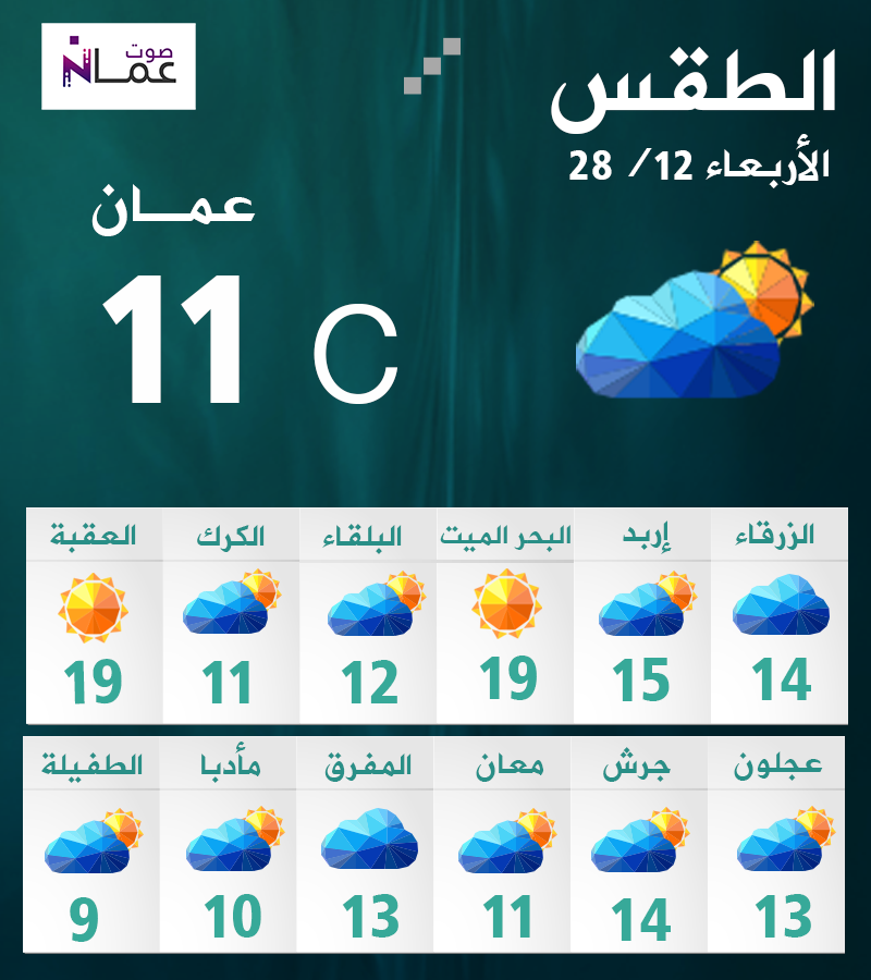 يوم الخميس؛ يطرأ ارتفاع قليل على درجات الحرارة، مع بقاء الأجواء باردة في أغلب المناطق، ولطيفة الحرارة في الأغوار والعقبة، مع ظهور بعض الغيوم على ارتفاعات منخفضة، والرياح جنوبية شرقية معتدلة السرعة.
