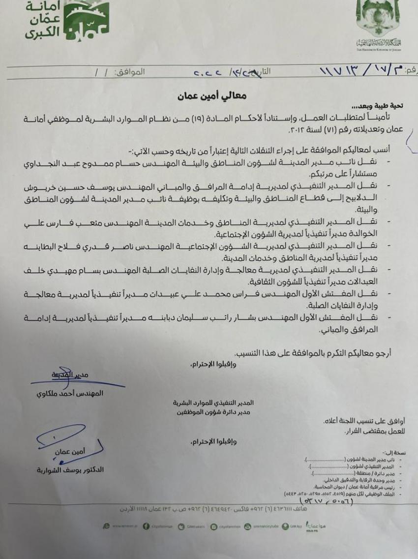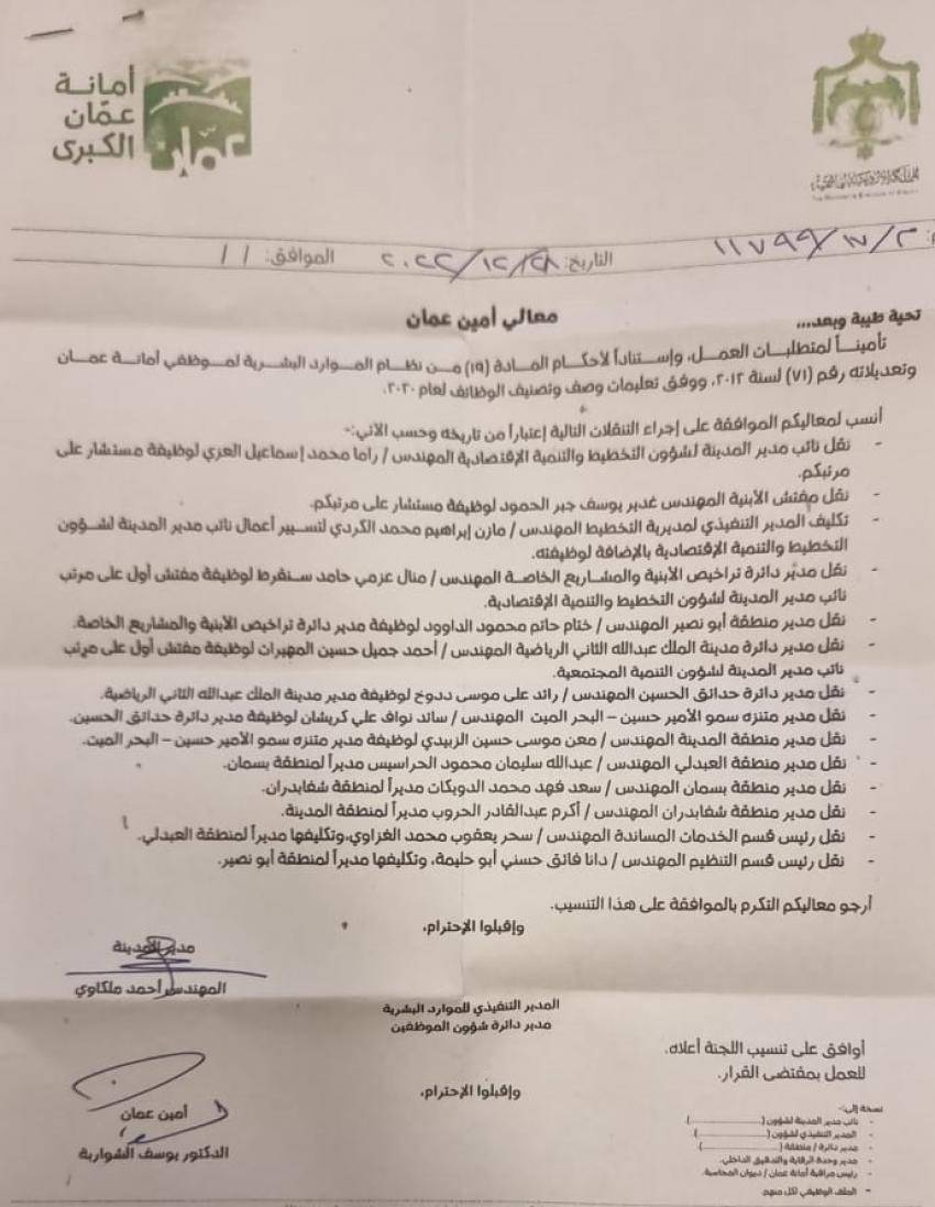 أجرى أمين عمان الدكتور يوسف الشواربة تنقلات إدارية بين مدراء المديريات في أمانة عمان الكبرى.