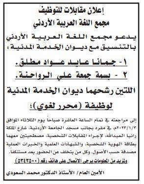 عدد من المؤسسات الحكومية، اليوم الإثنين، عن حاجتها لتعيين وتعبيئة وظائف شاغرة وإجراء مقابلات شخصية، وذلك بالتنسيق مع ديوان الخدمة المدنية.