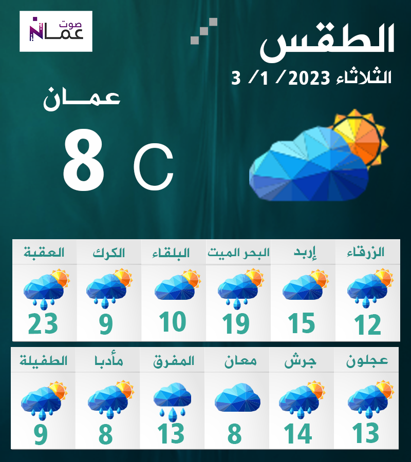 يوم الاربعاء، فيطرأ انخفاض طفيف على درجات الحرارة ، وتكون الأجواء باردة جداً وغائمة جزئياً الى غائمة احياناً مع هطول زخات من المطر في اماكن متفرقة من المملكة، ويتوقع ان تكون الهطولات غزيرة في شرق المملكة ومصحوبة بالرعد وتساقط كثيف للبرد، كما تشير التحليلات الى توقع هطول زخات من الثلج تكون ممزوجة احيانا بالمطر في اجزاء من البادية الشمالية الشرقية المحاذية للحدود العراقية، والرياح شمالية شرقية الى شماليه غربيه نشطة السرعة.