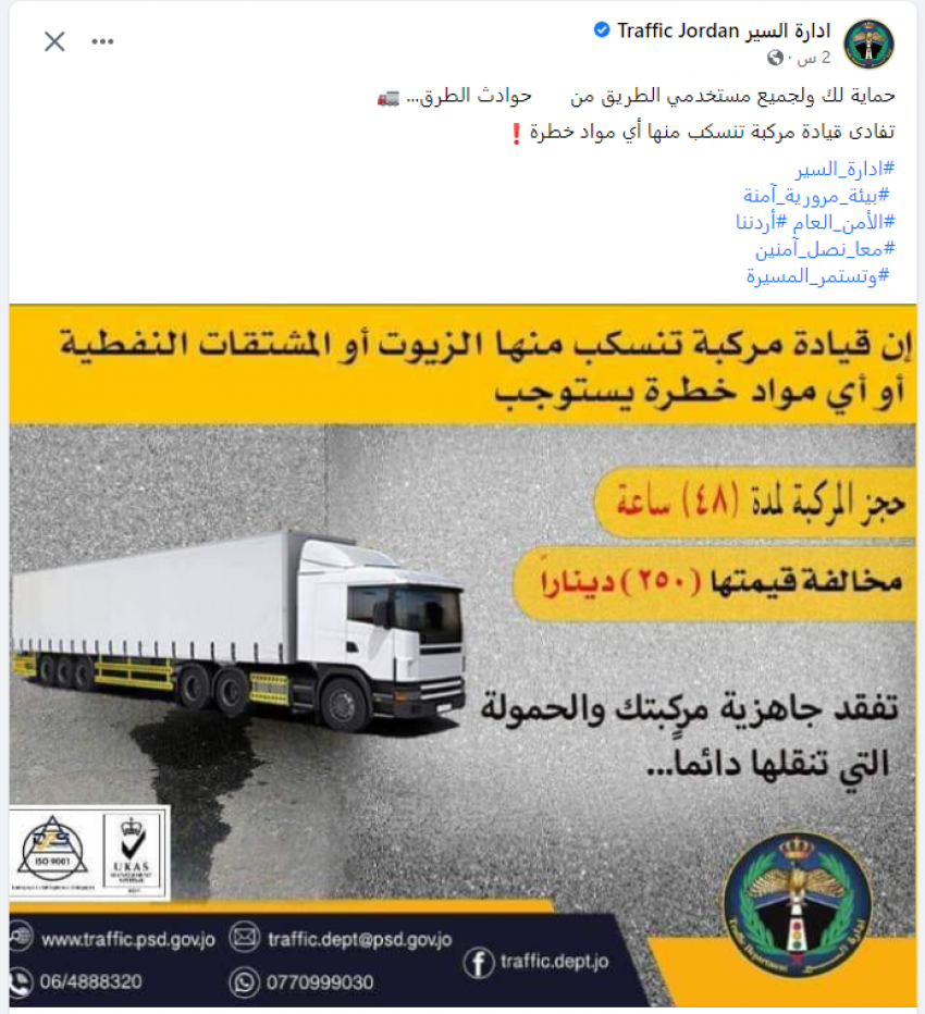 وقالت الإدارة في ادراج لها عبر فيسبوك، إن المخالفة تتمثل بحجز المركبة لمدة 48 ساعة، وغرامة بقيمة 250 دينارا.