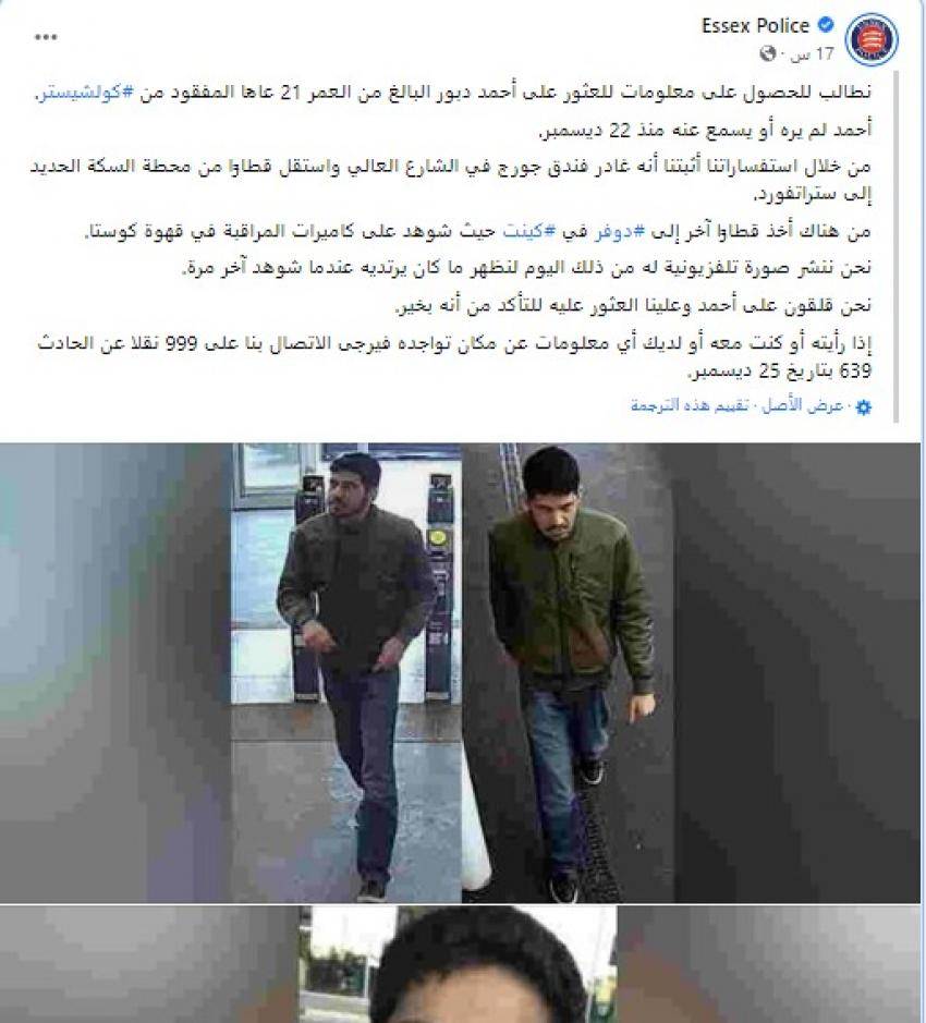 وأشارت الشرطة في منشور لها عبر حسابها الرسمي على فيسبوك، أن الشاب أحمد دبور المقيم في مدينة "كولشيستر" مفقود منذ 16 يوما.