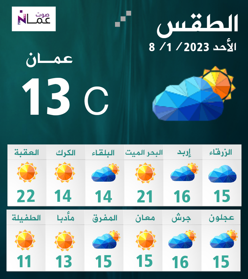 وبحسب طقس العرب، يكون الطقس بارداً نسبياً مع ظهور السحب المتفرقة أثناء النهار، ويحتمل هطول زخات محلية ومتفرقة من الأمطار في أقصى شرق الأردن، وتكون الرياح جنوبية شرقية معتدلة السرعة.