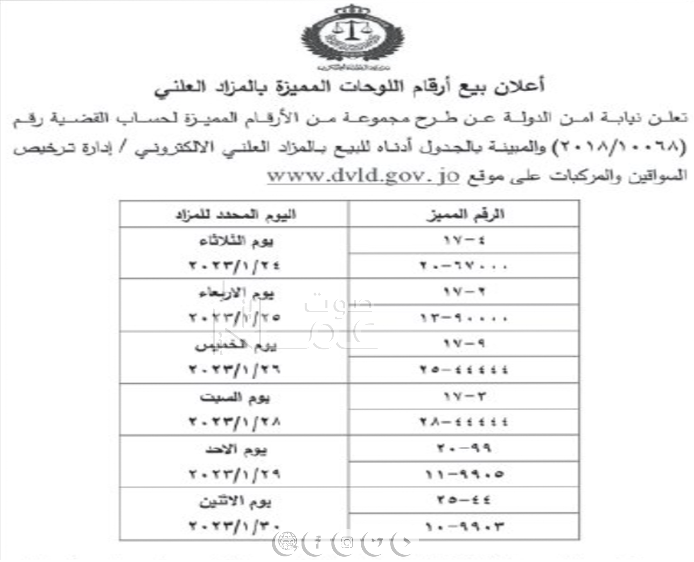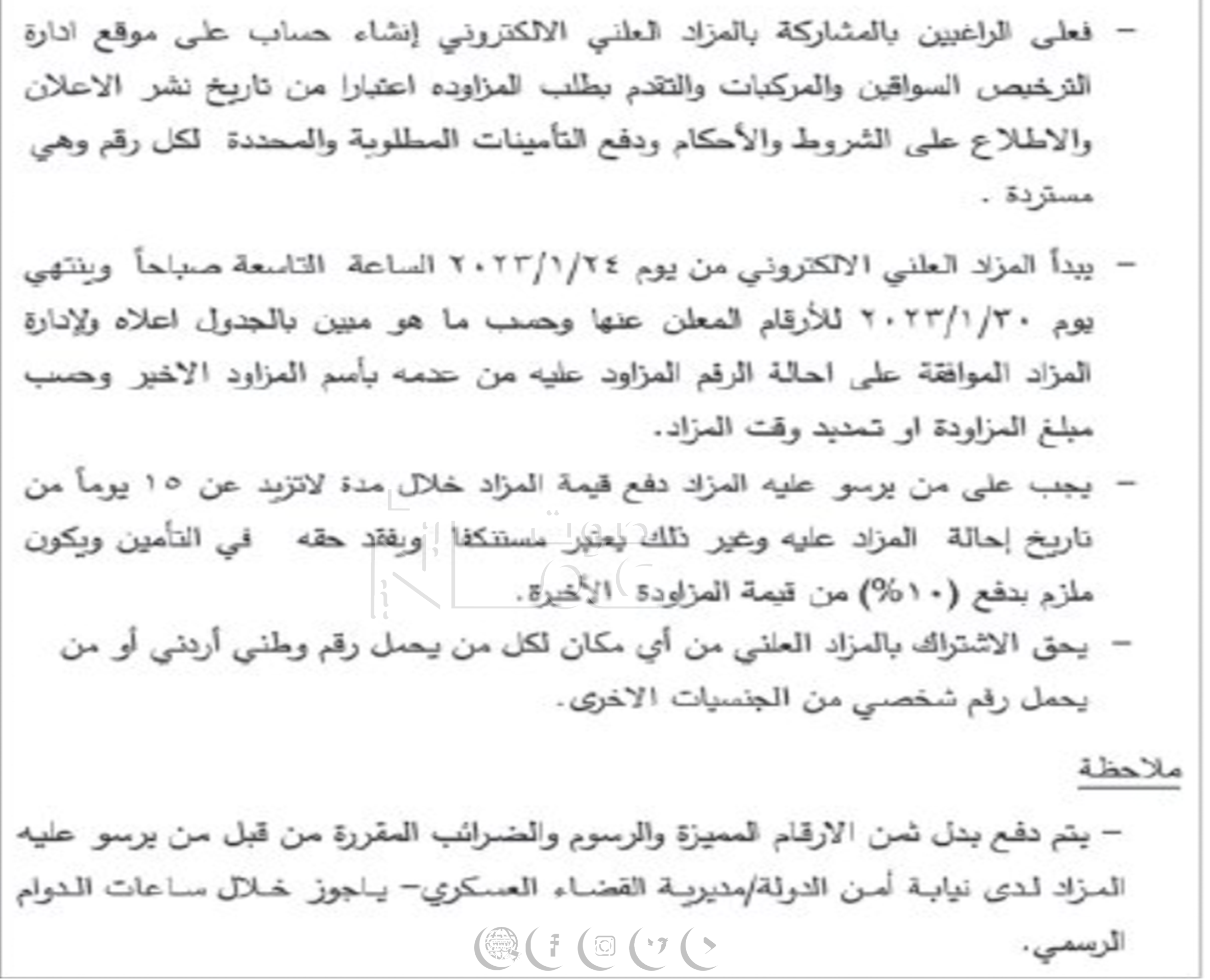 وأشارت أنه يبدأ المزاد من يوم 24/1/2023 يونتهي بـ 30/1/2023 للأرقام المعلن عنها