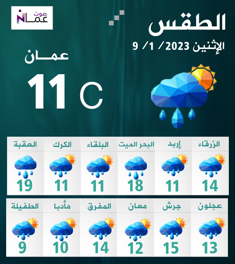 الثلاثاء، تكون الأجواء باردة في أغلب المناطق، ولطيفة الحرارة في الأغوار والبحر الميت والعقبة، مع ظهور الغيوم على ارتفاعات منخفضة خاصة في الشمال والوسط، وتكون الرياح جنوبية شرقية معتدلة السرعة.