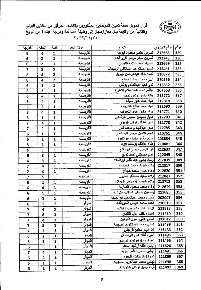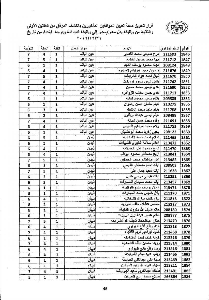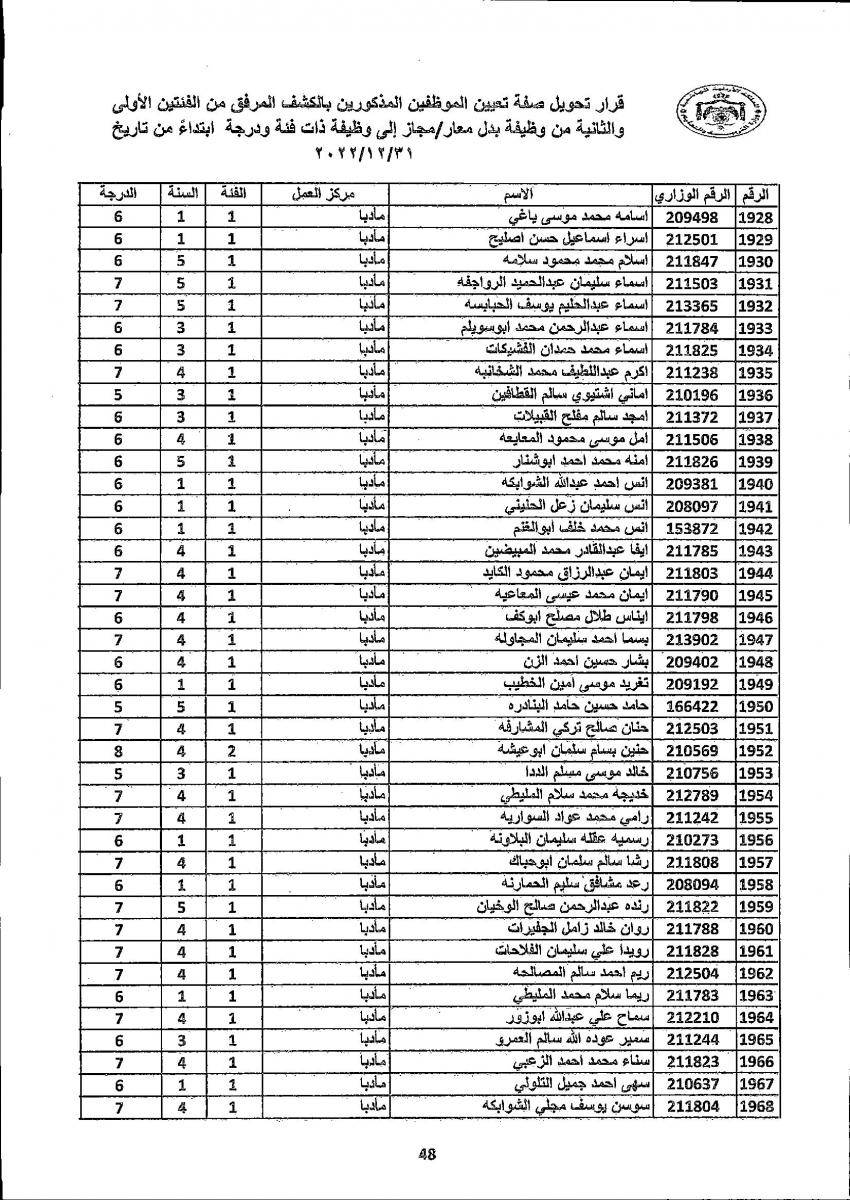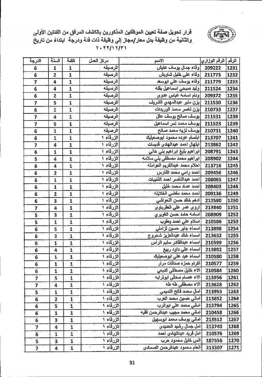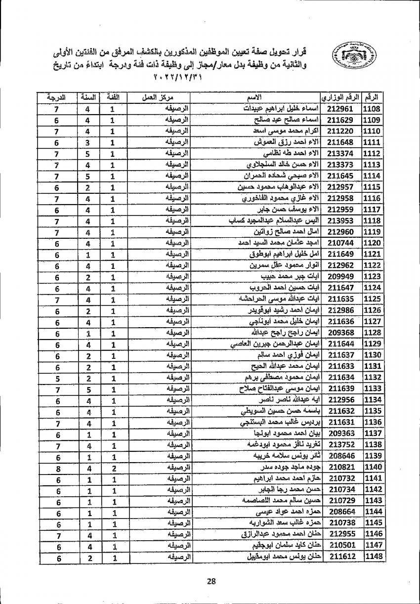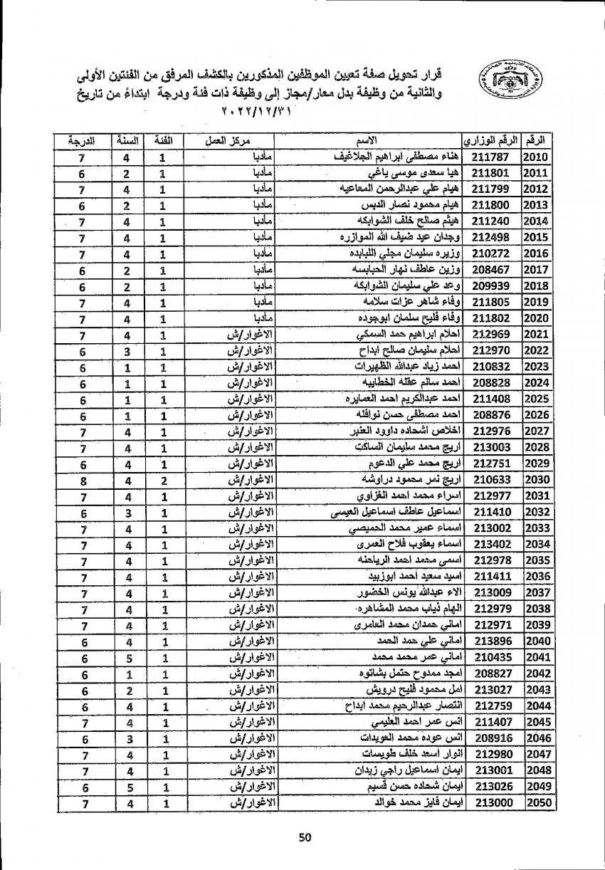 ووفق التعميم، قرر الوزير تعيين المذكورين في الكشف المرفق أدناه في ملاك وزارة التربية والتعليم بعقود وظائف ذات فئات ودرجات للفئتين الأولى والثانية براتب السنة والدرجة المبينين إزاء اسم كل منهم، ابتداء من تاريخ 31/12/2022
