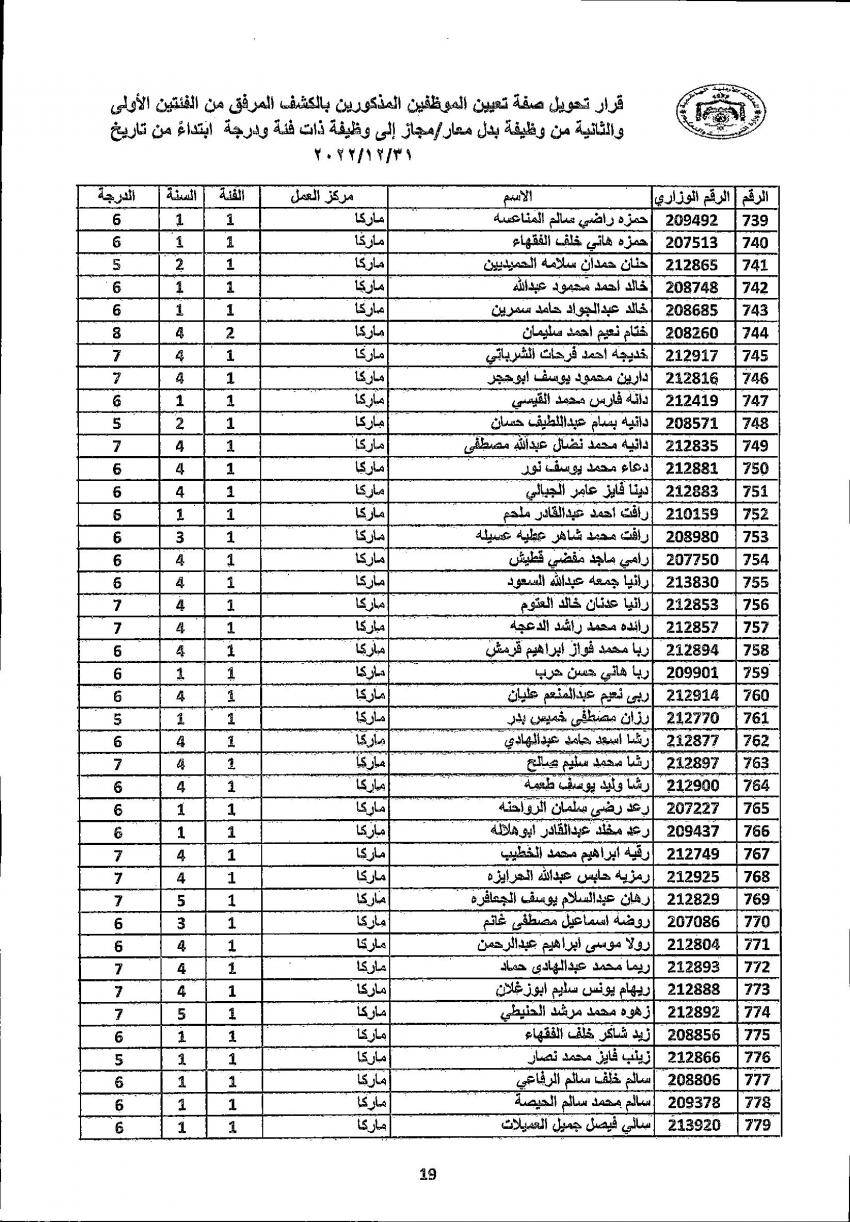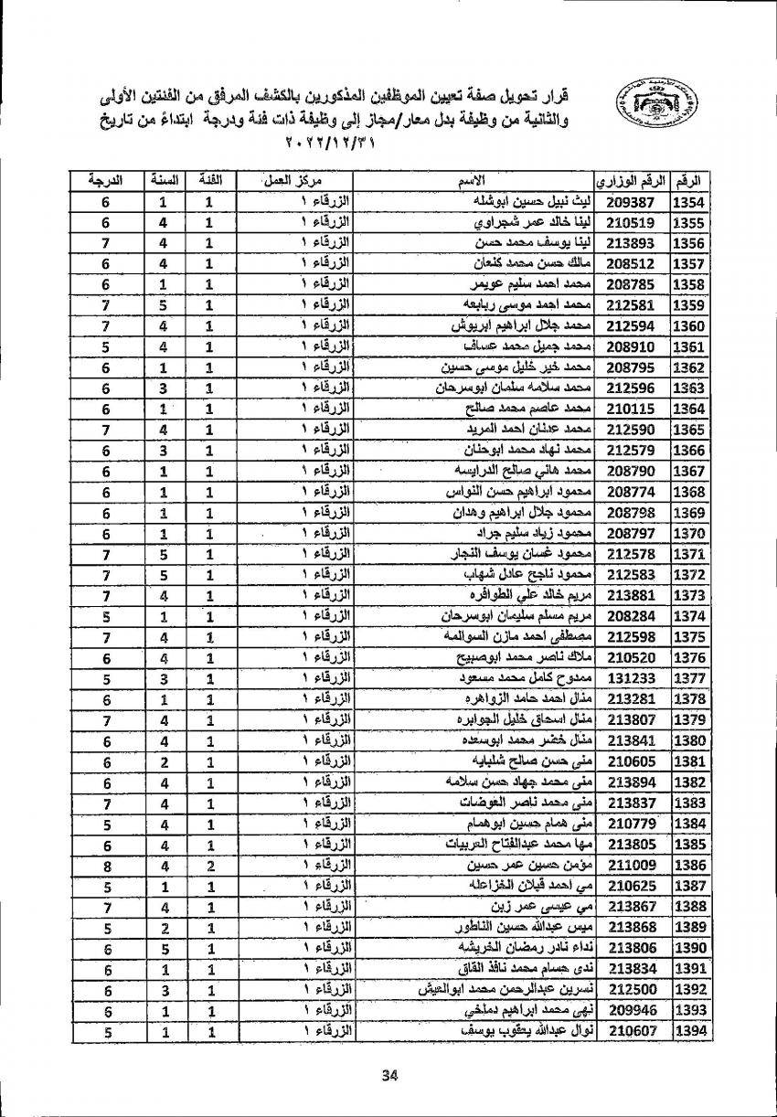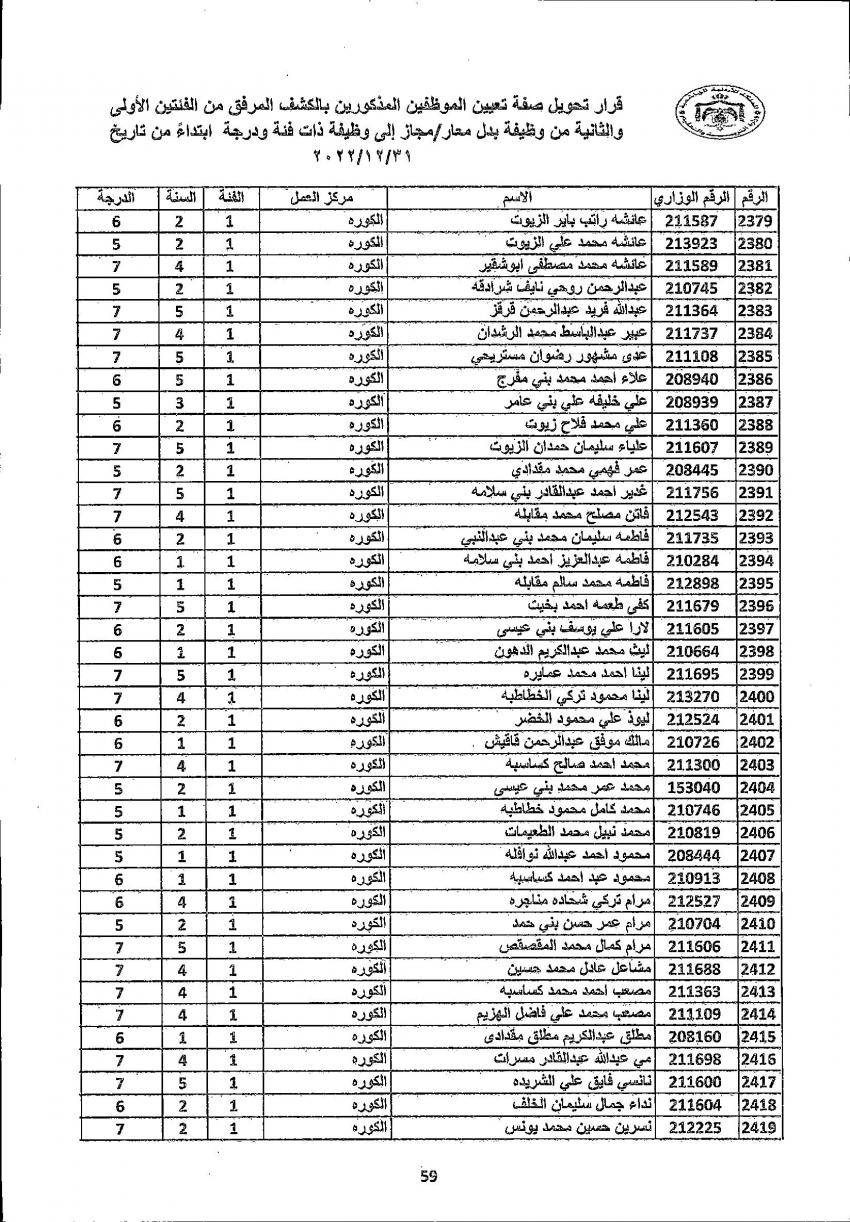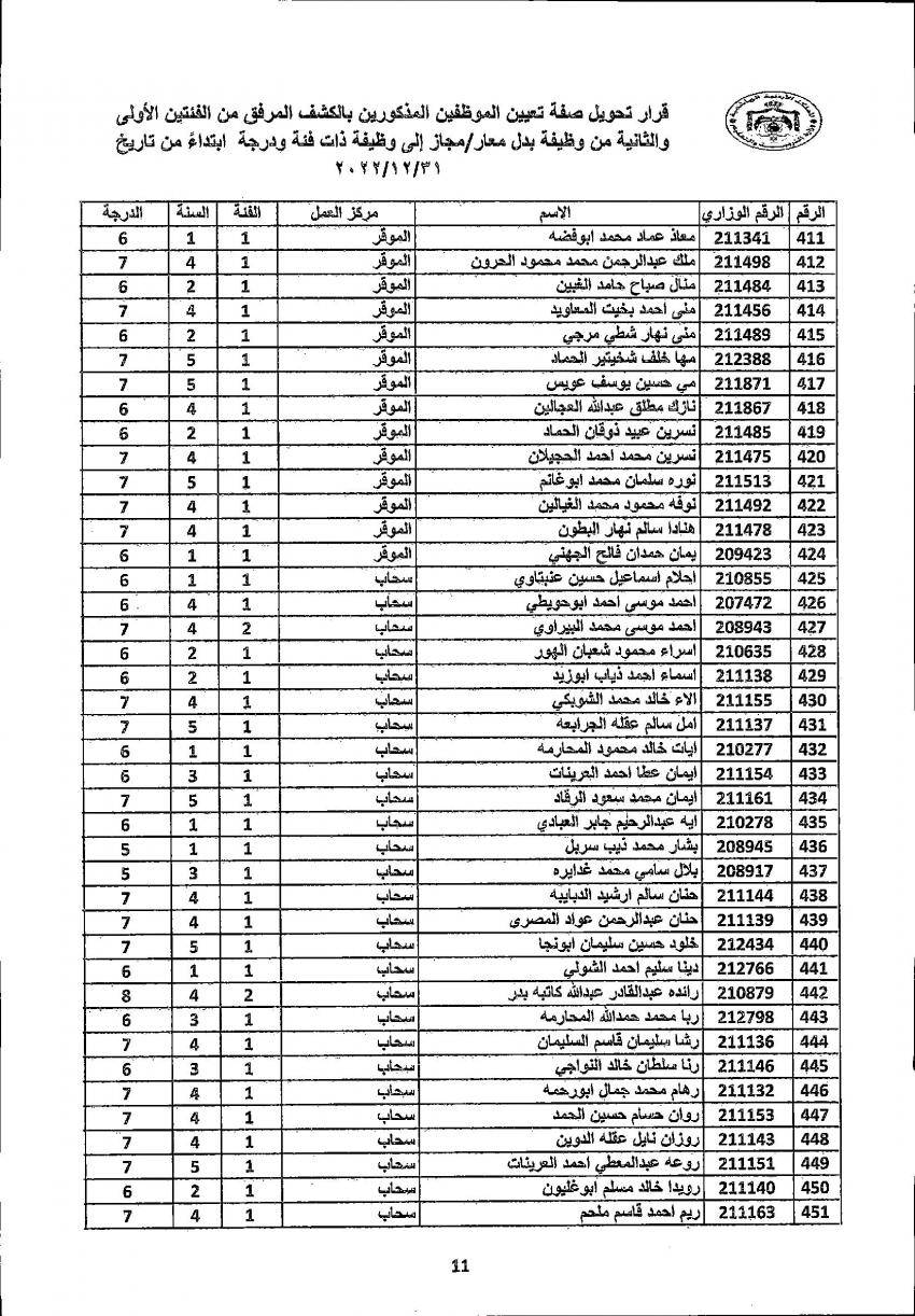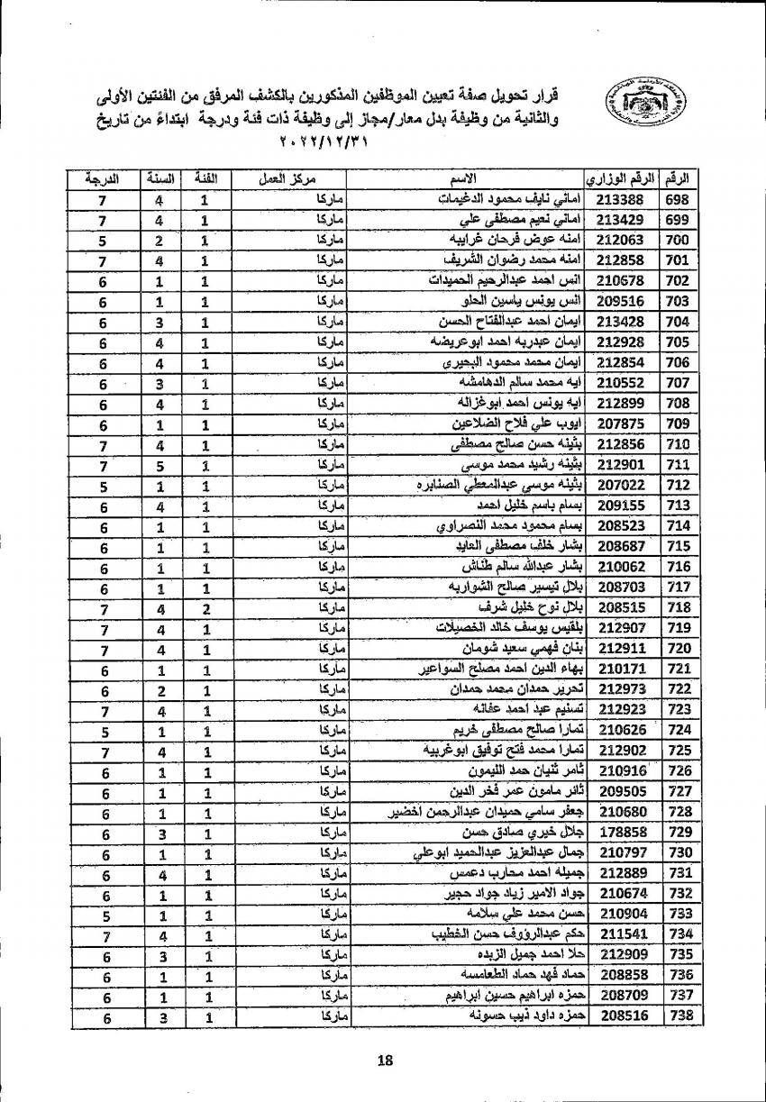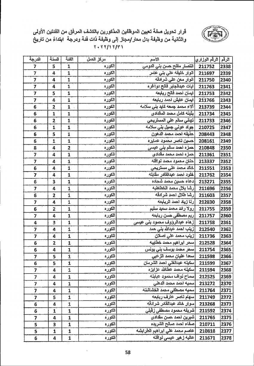 ووفق التعميم، قرر الوزير تعيين المذكورين في الكشف المرفق أدناه في ملاك وزارة التربية والتعليم بعقود وظائف ذات فئات ودرجات للفئتين الأولى والثانية براتب السنة والدرجة المبينين إزاء اسم كل منهم، ابتداء من تاريخ 31/12/2022
