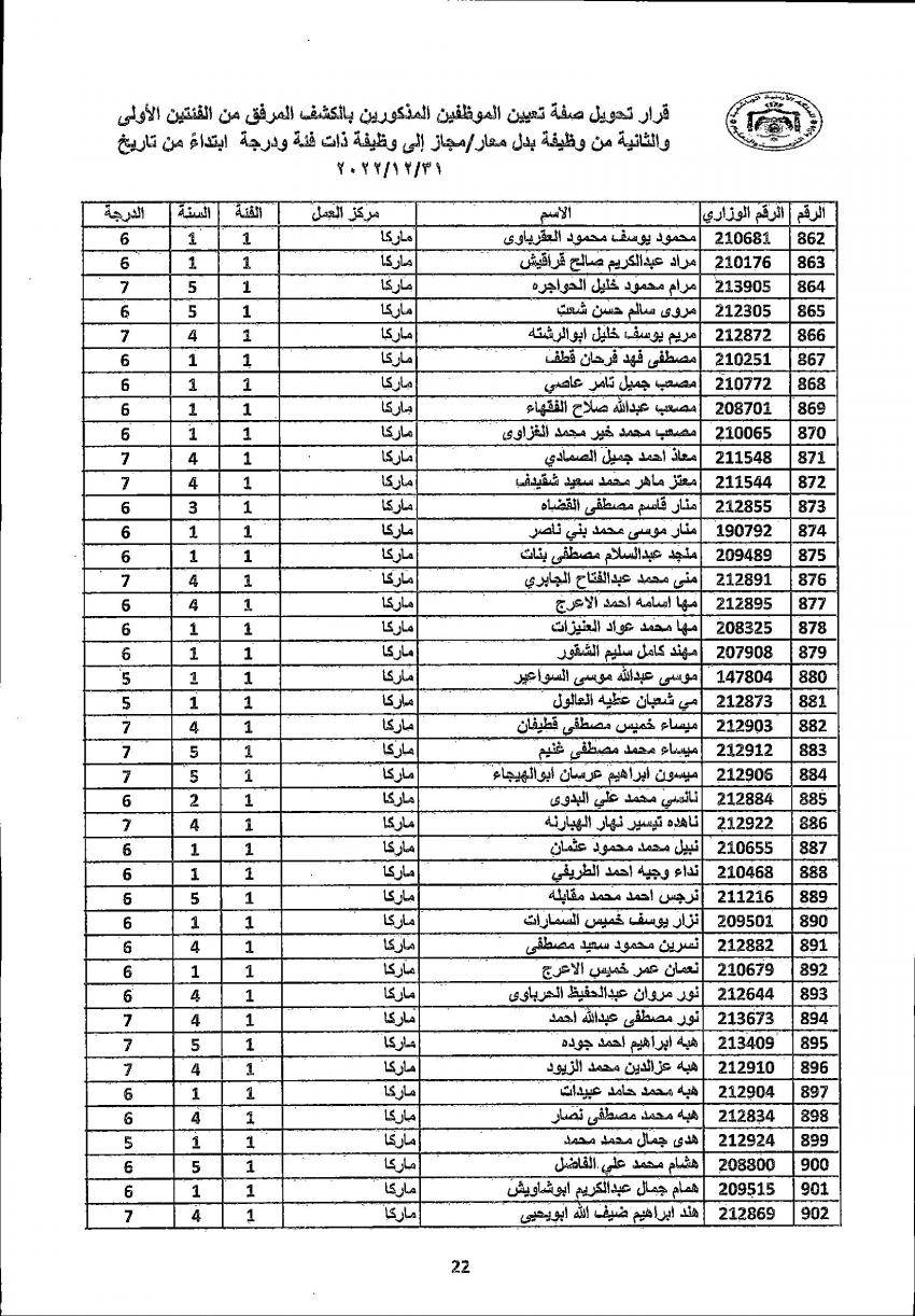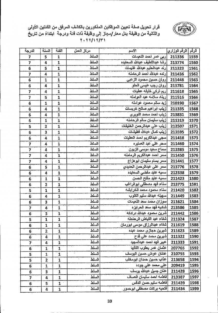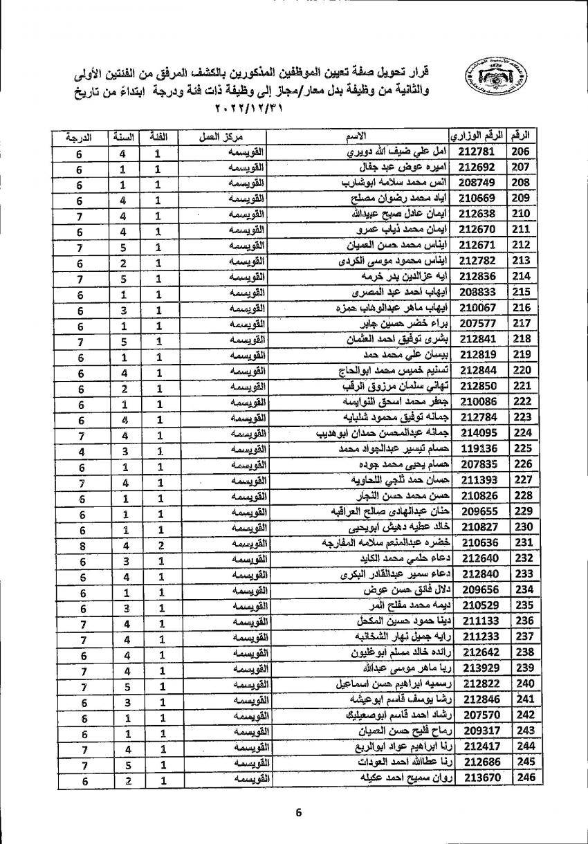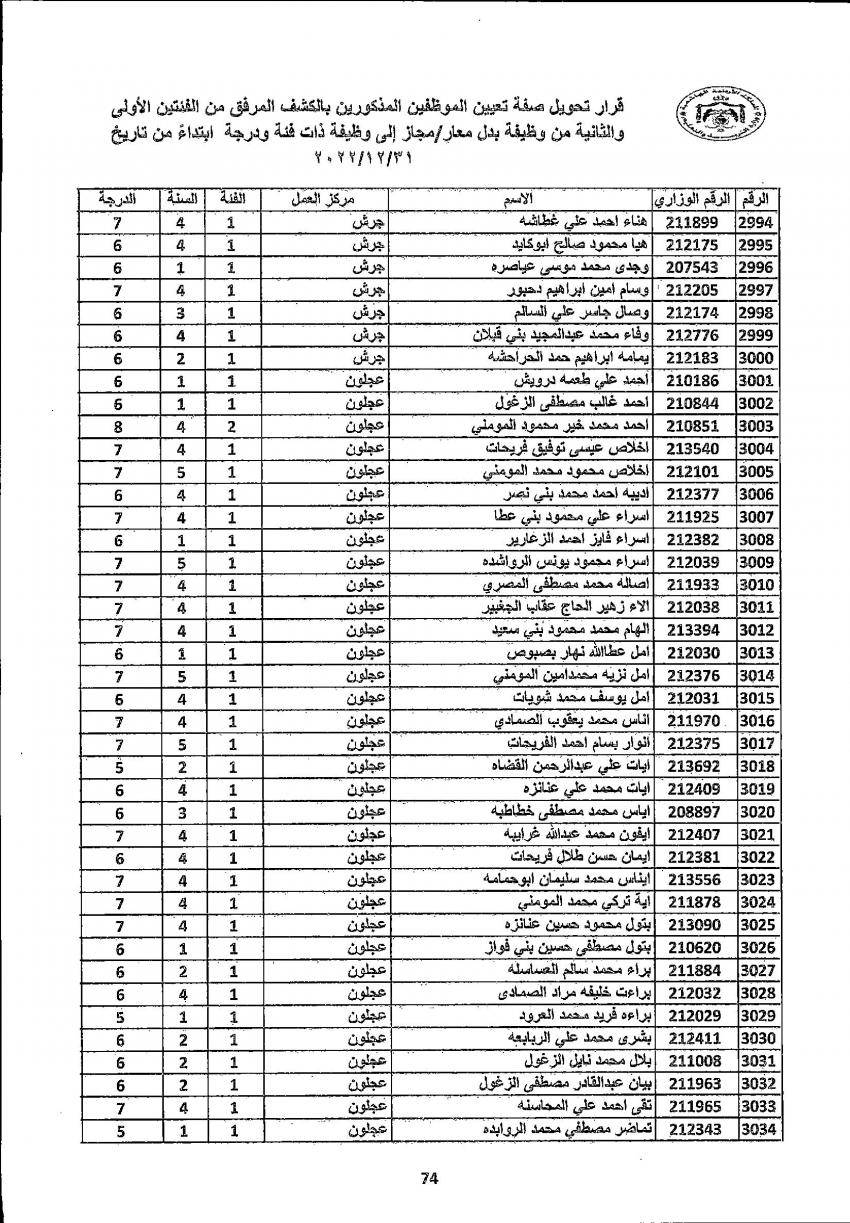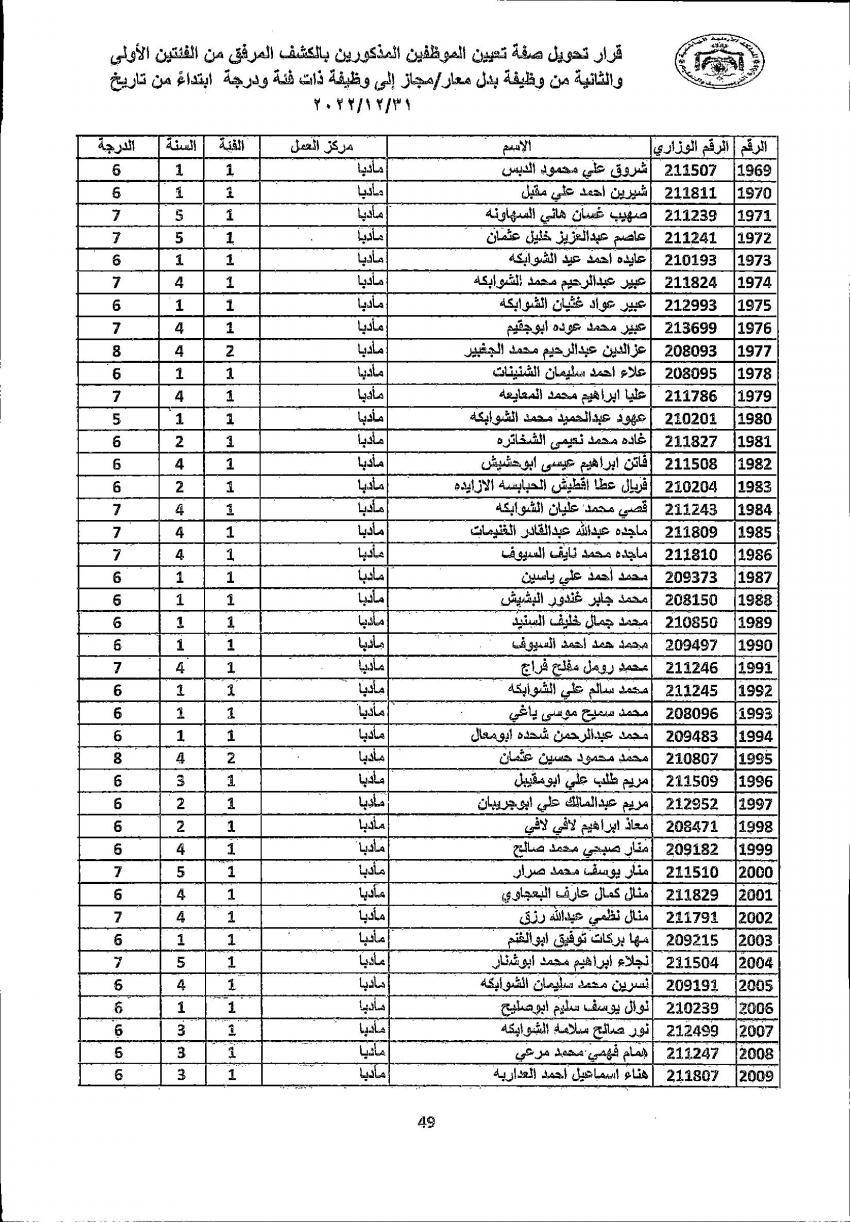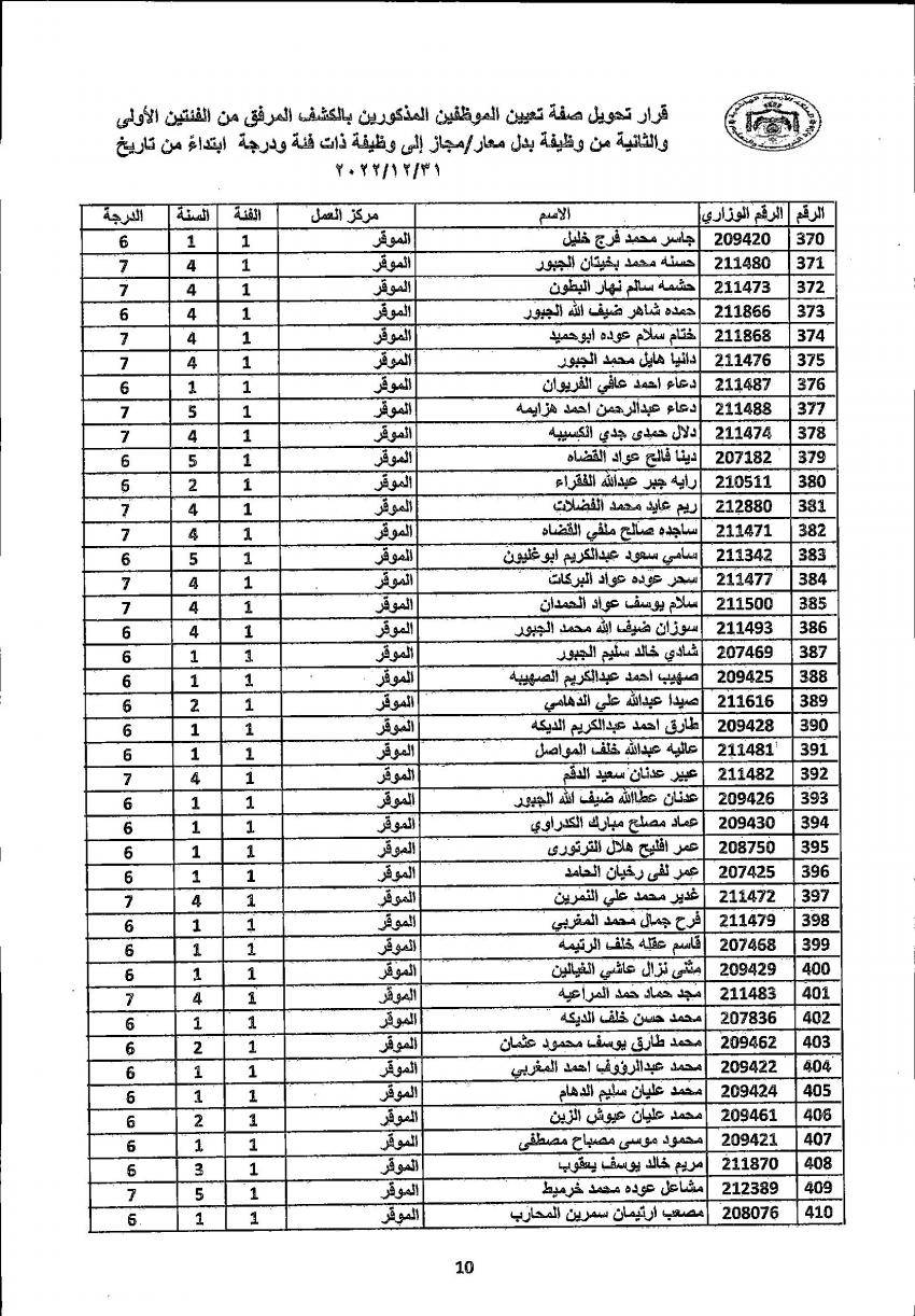 ووفق التعميم، قرر الوزير تعيين المذكورين في الكشف المرفق أدناه في ملاك وزارة التربية والتعليم بعقود وظائف ذات فئات ودرجات للفئتين الأولى والثانية براتب السنة والدرجة المبينين إزاء اسم كل منهم، ابتداء من تاريخ 31/12/2022