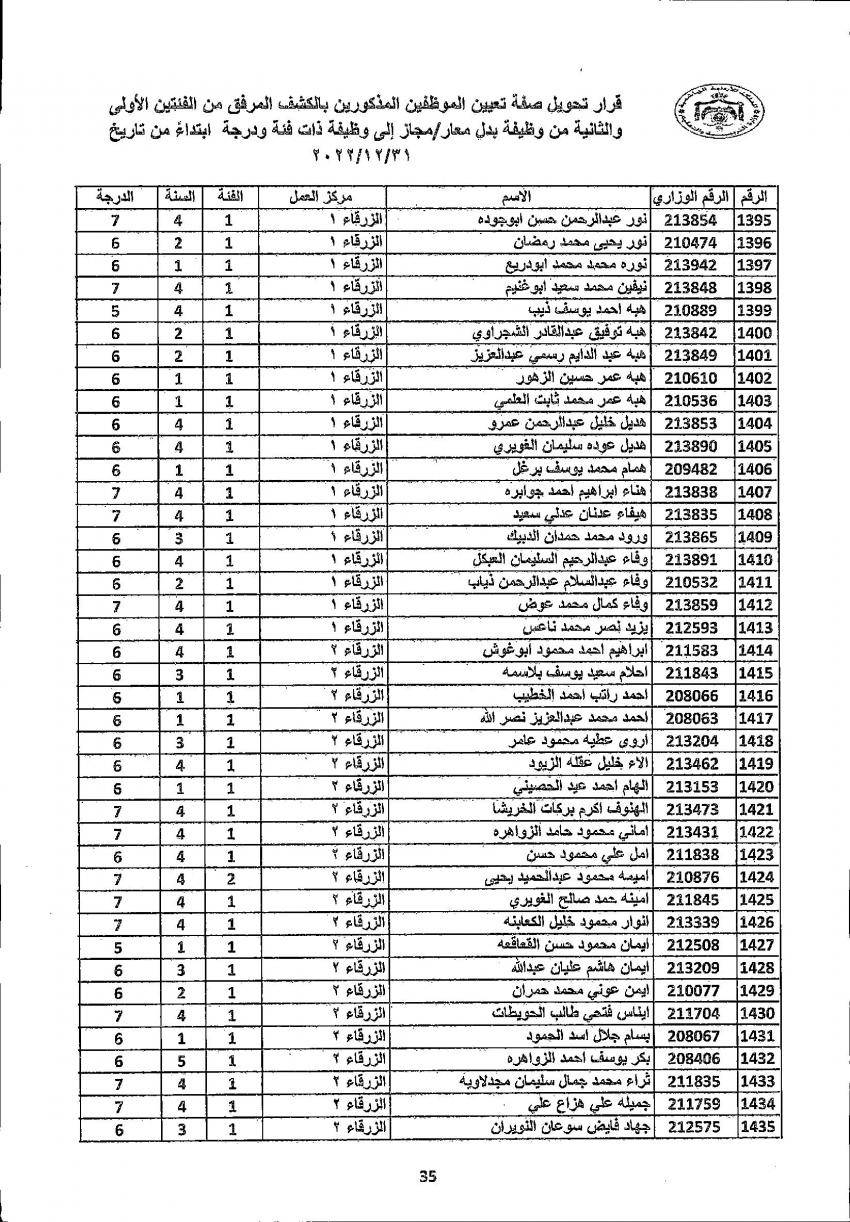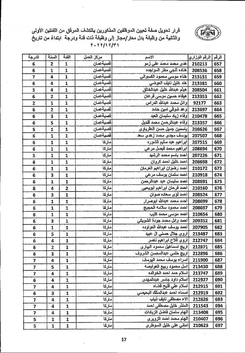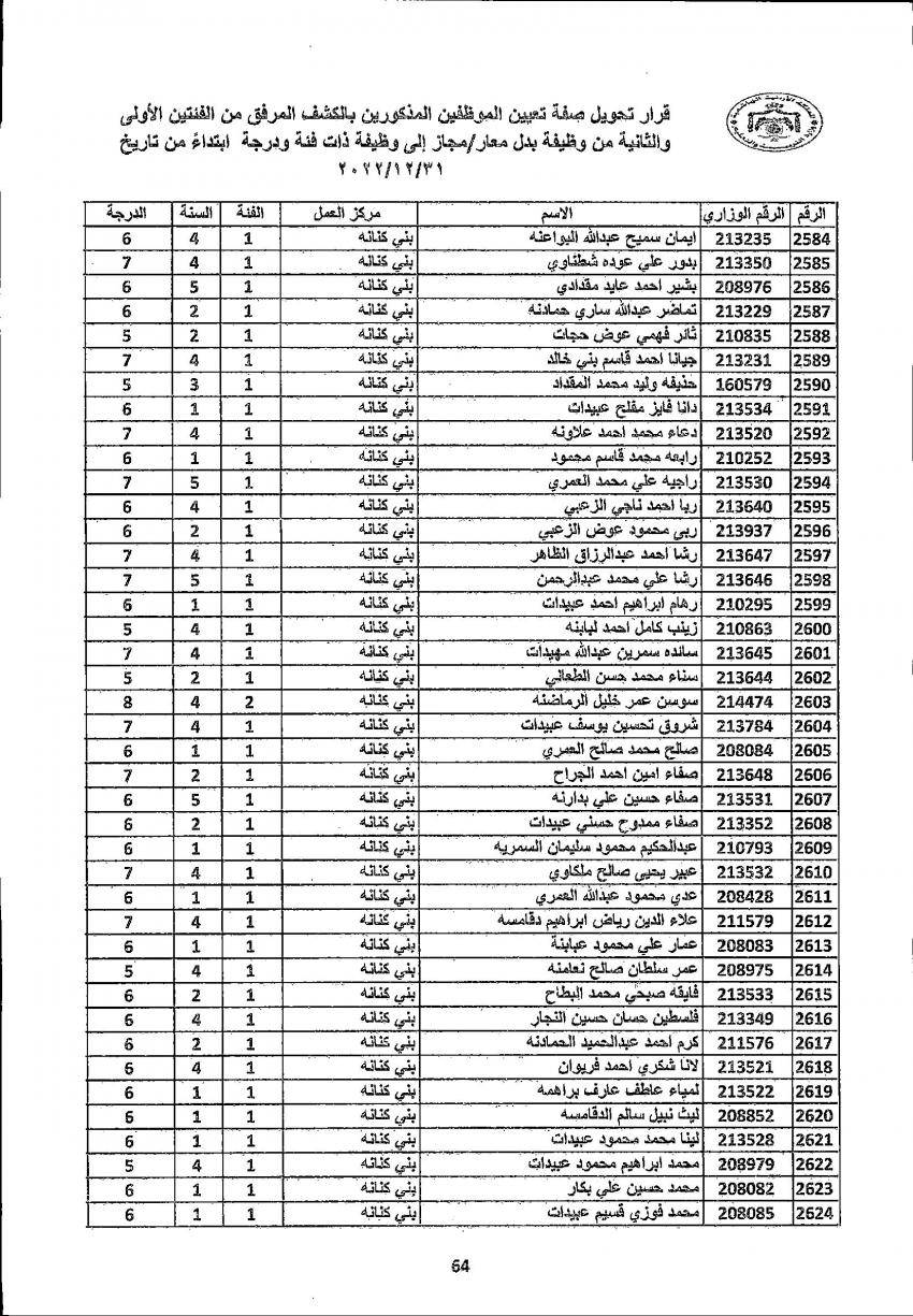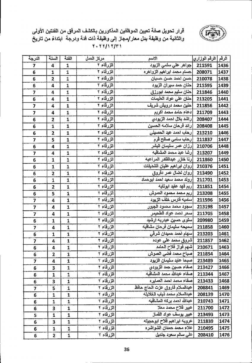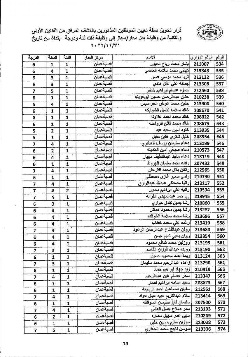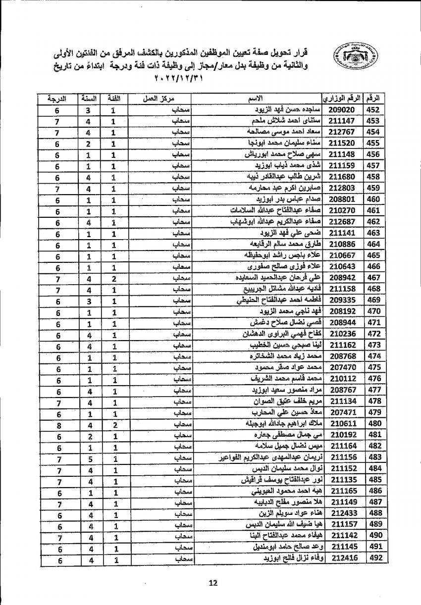 ووفق التعميم، قرر الوزير تعيين المذكورين في الكشف المرفق أدناه في ملاك وزارة التربية والتعليم بعقود وظائف ذات فئات ودرجات للفئتين الأولى والثانية براتب السنة والدرجة المبينين إزاء اسم كل منهم، ابتداء من تاريخ 31/12/2022