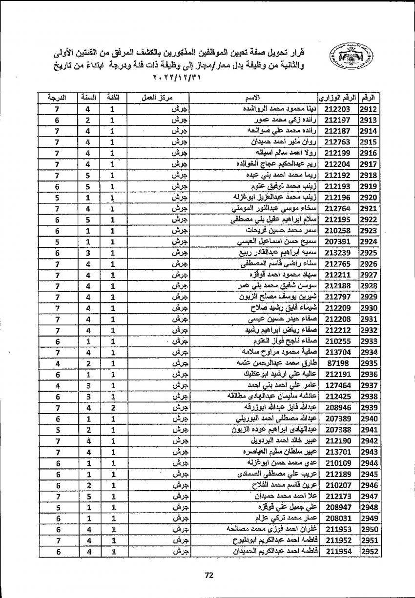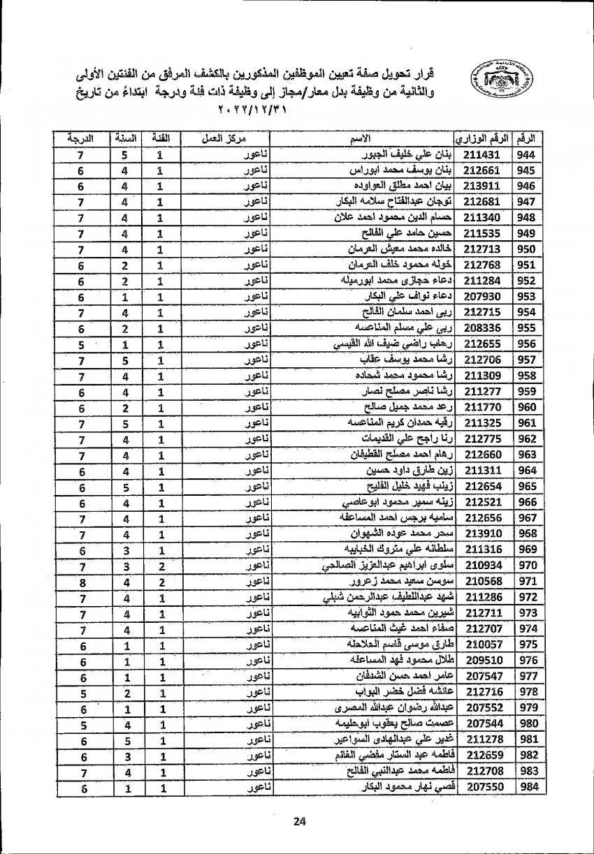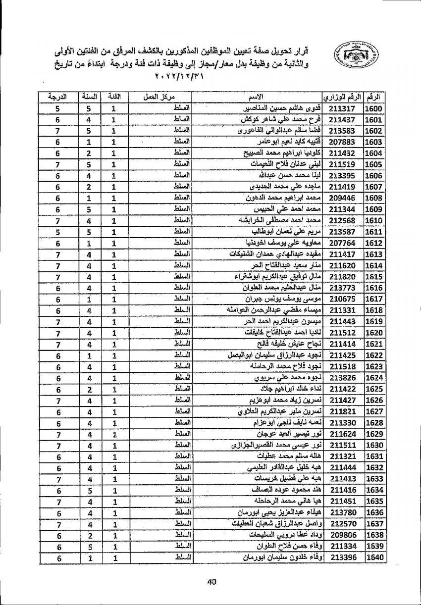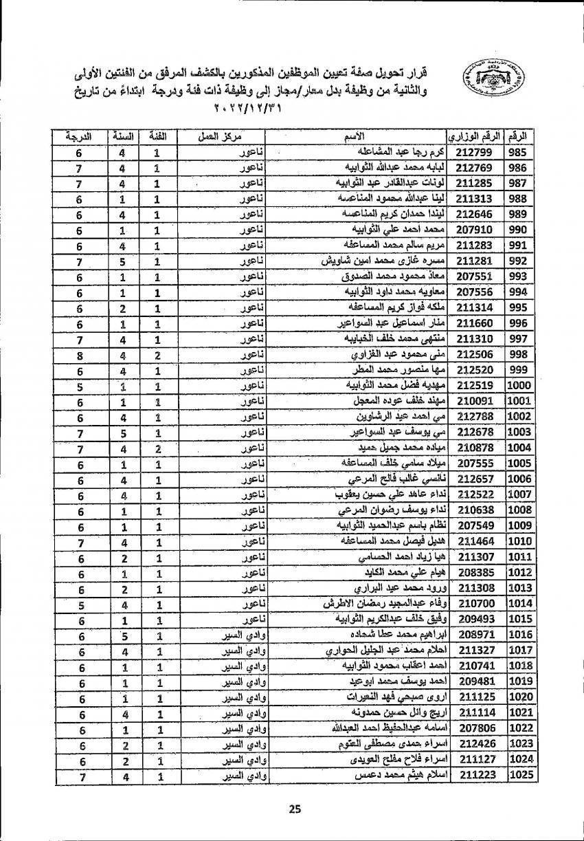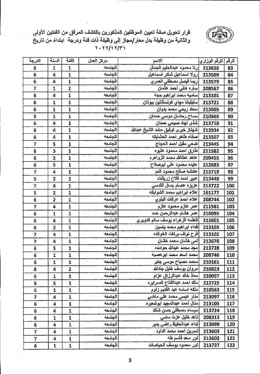 ووفق التعميم، قرر الوزير تعيين المذكورين في الكشف المرفق أدناه في ملاك وزارة التربية والتعليم بعقود وظائف ذات فئات ودرجات للفئتين الأولى والثانية براتب السنة والدرجة المبينين إزاء اسم كل منهم، ابتداء من تاريخ 31/12/2022