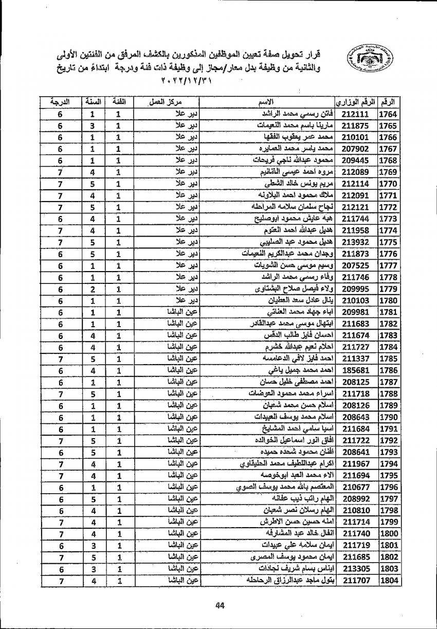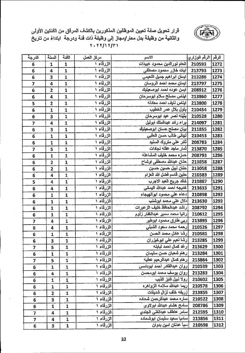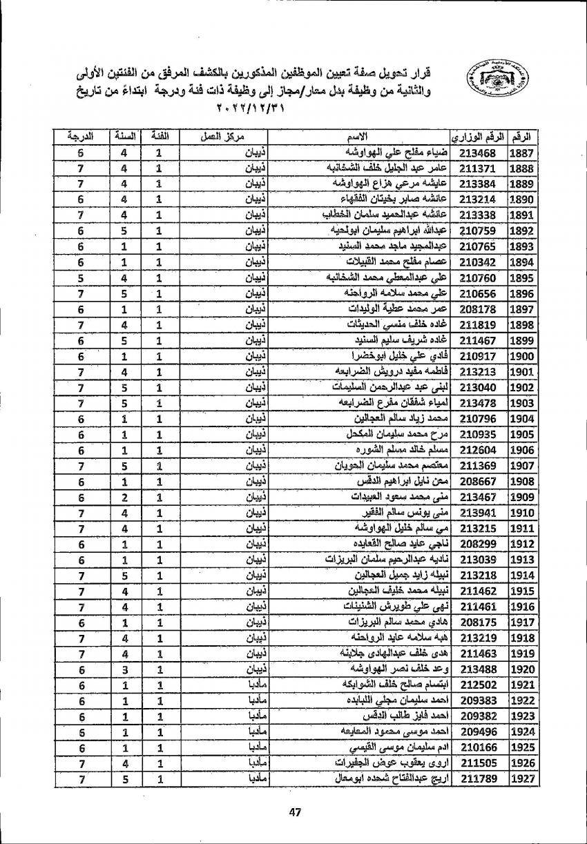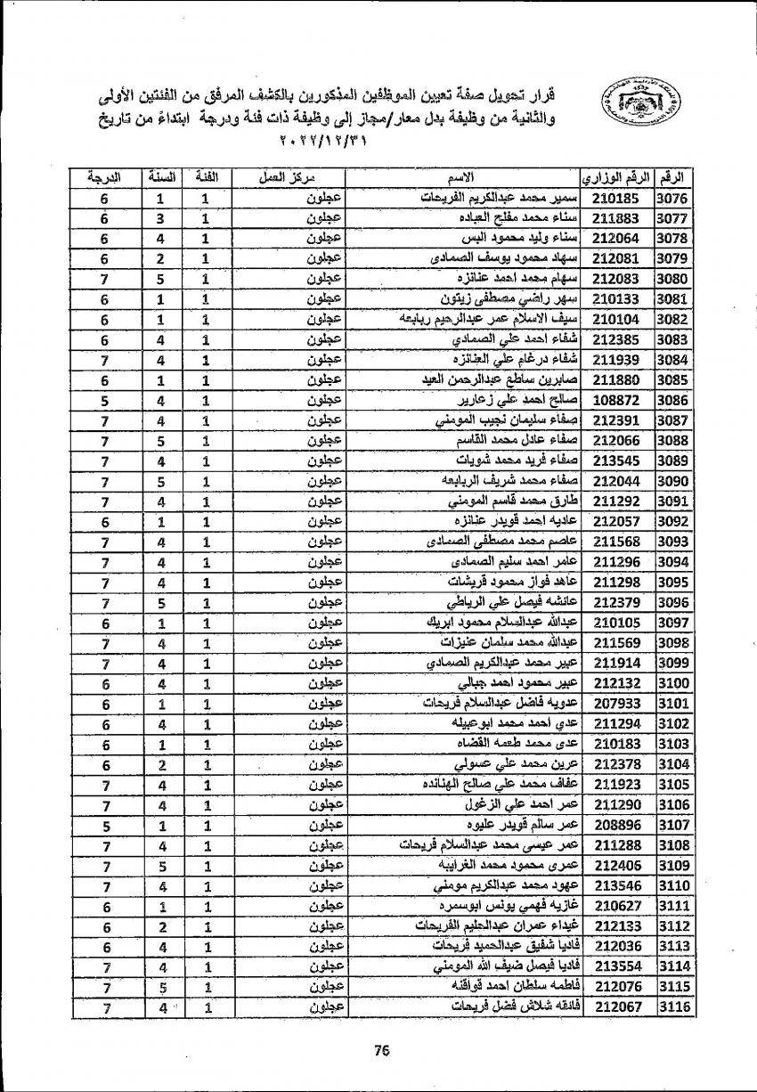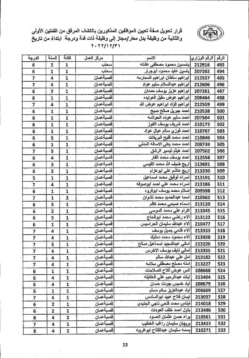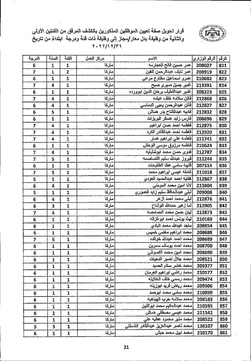 ووفق التعميم، قرر الوزير تعيين المذكورين في الكشف المرفق أدناه في ملاك وزارة التربية والتعليم بعقود وظائف ذات فئات ودرجات للفئتين الأولى والثانية براتب السنة والدرجة المبينين إزاء اسم كل منهم، ابتداء من تاريخ 31/12/2022