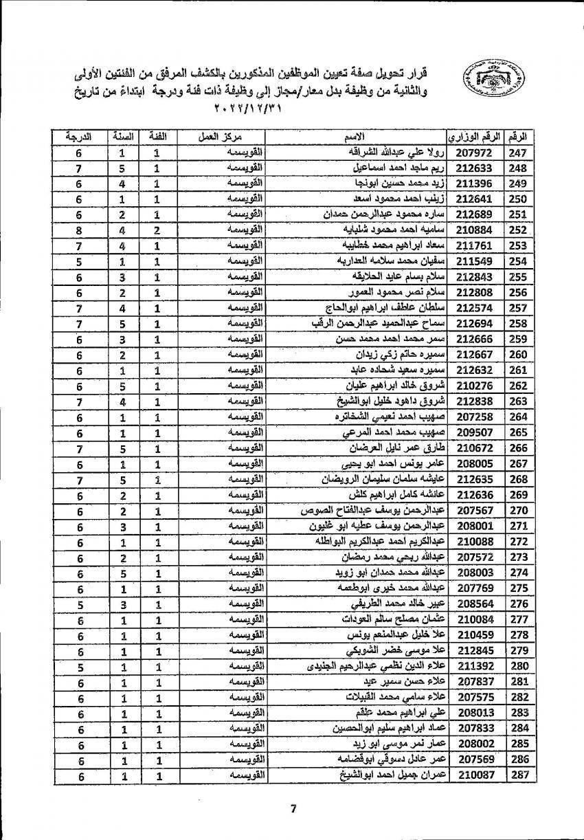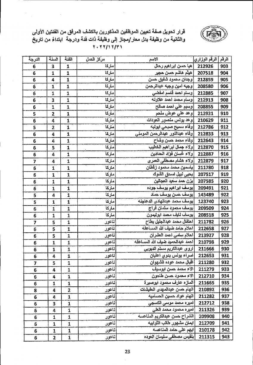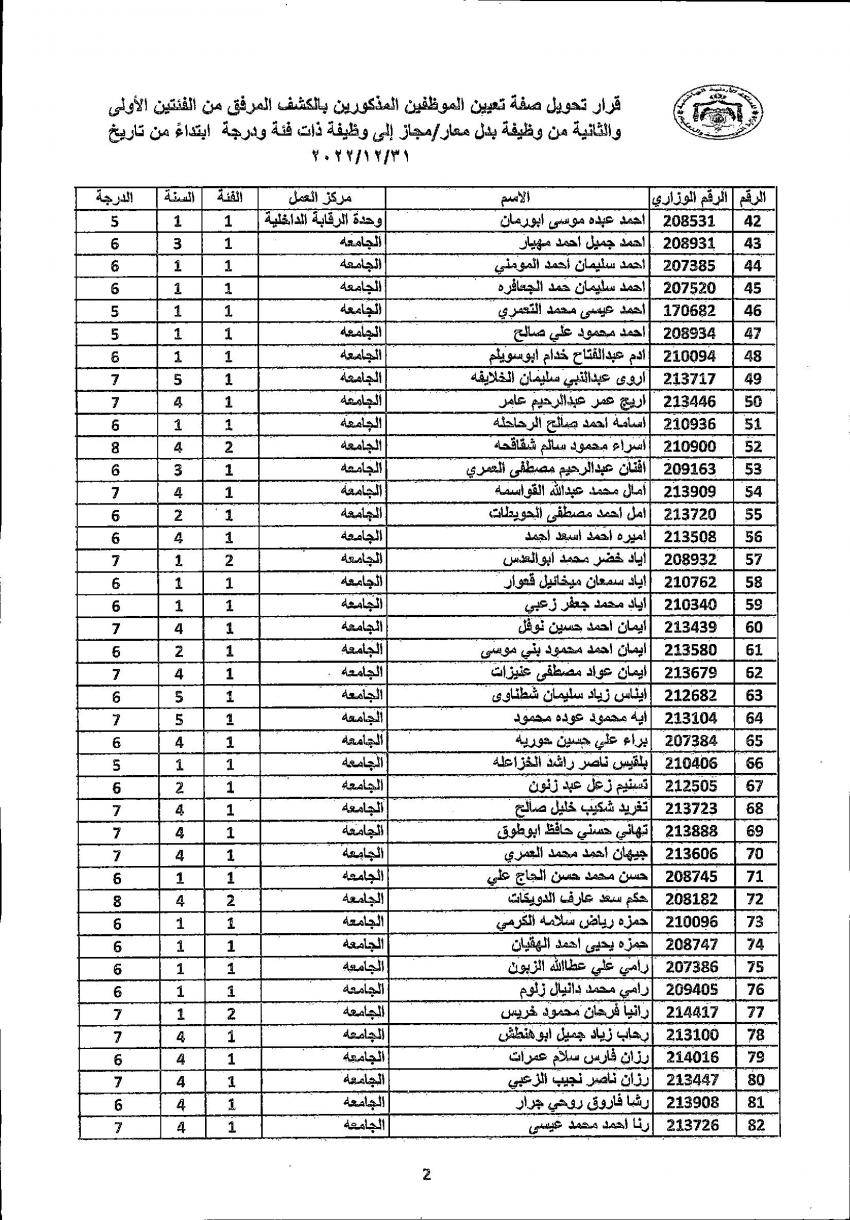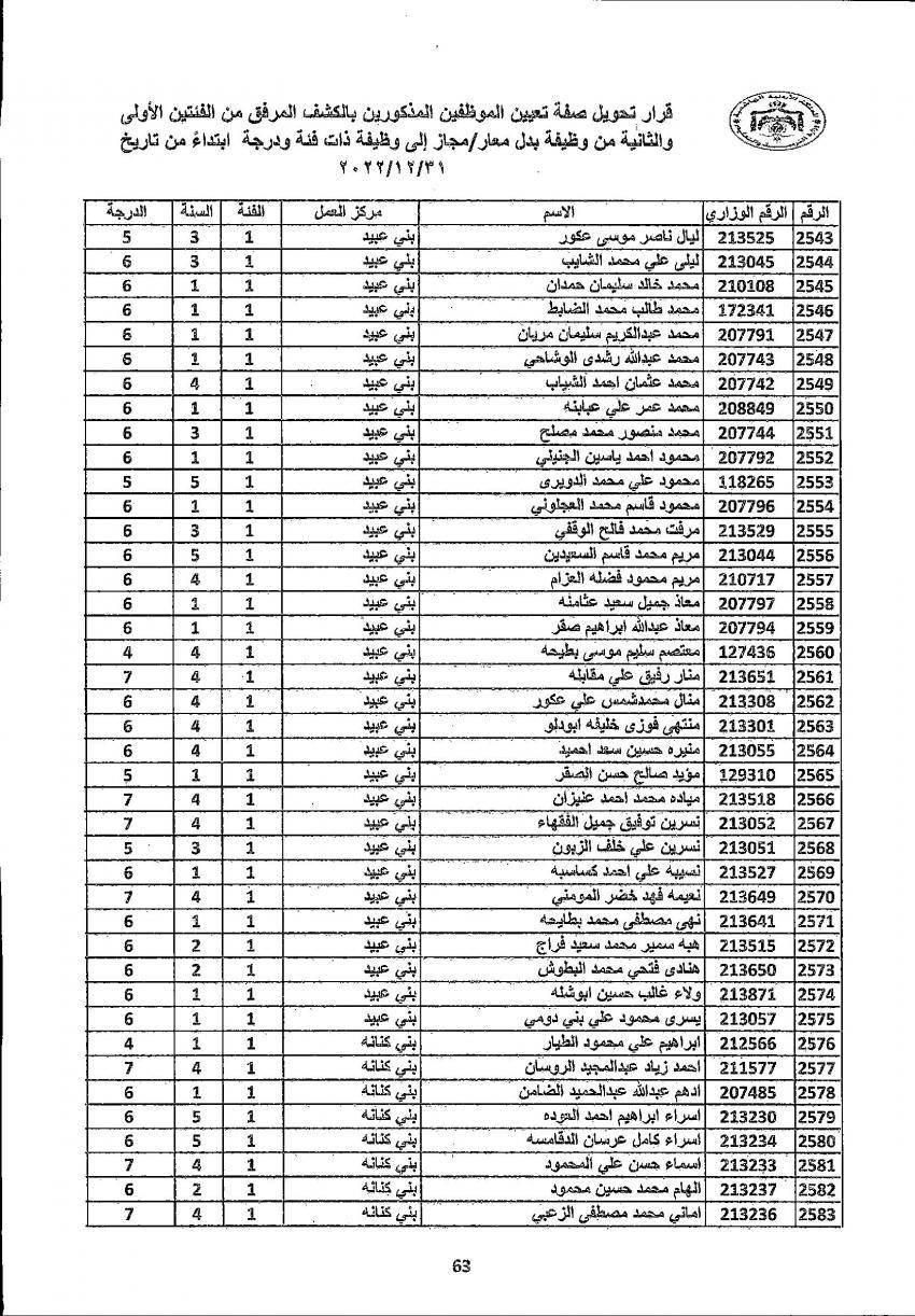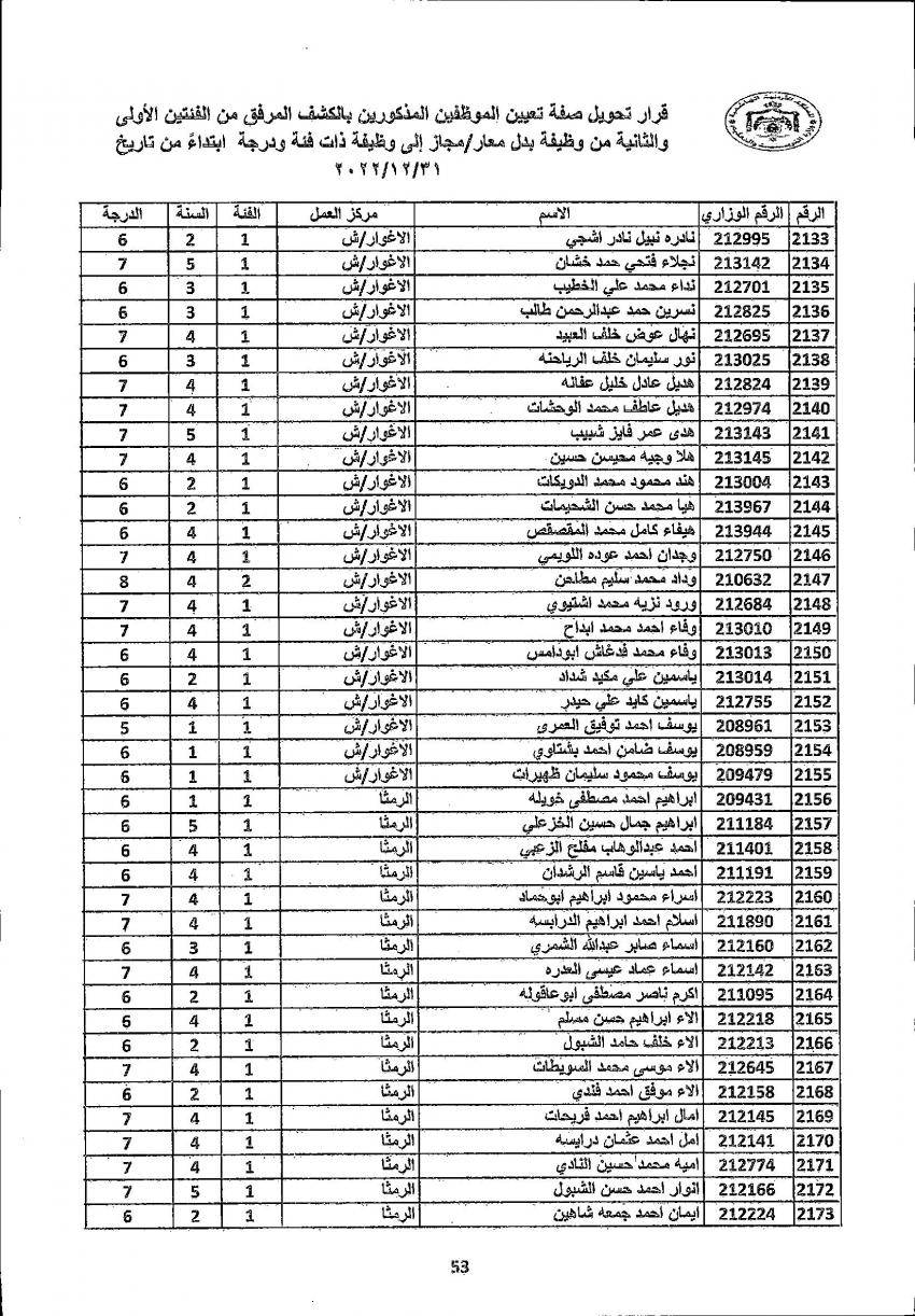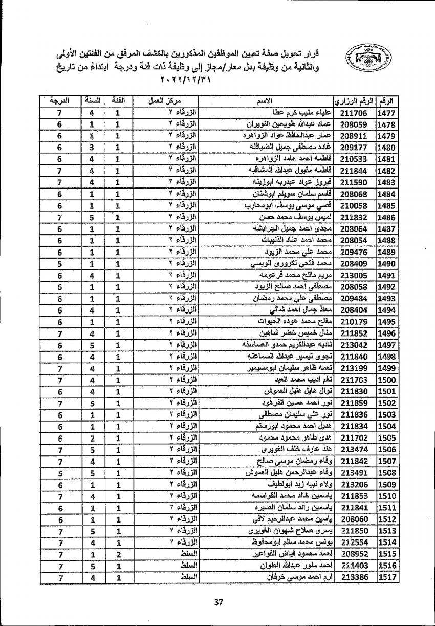 ووفق التعميم، قرر الوزير تعيين المذكورين في الكشف المرفق أدناه في ملاك وزارة التربية والتعليم بعقود وظائف ذات فئات ودرجات للفئتين الأولى والثانية براتب السنة والدرجة المبينين إزاء اسم كل منهم، ابتداء من تاريخ 31/12/2022