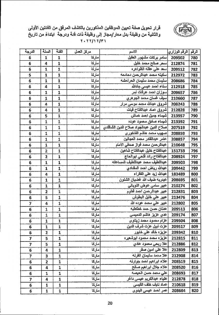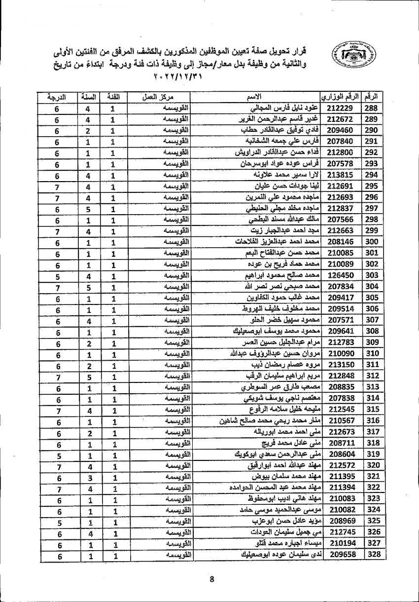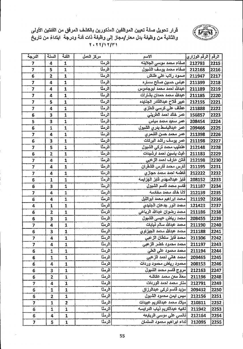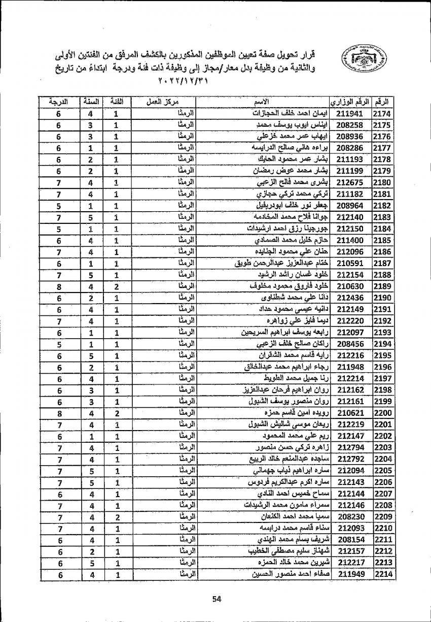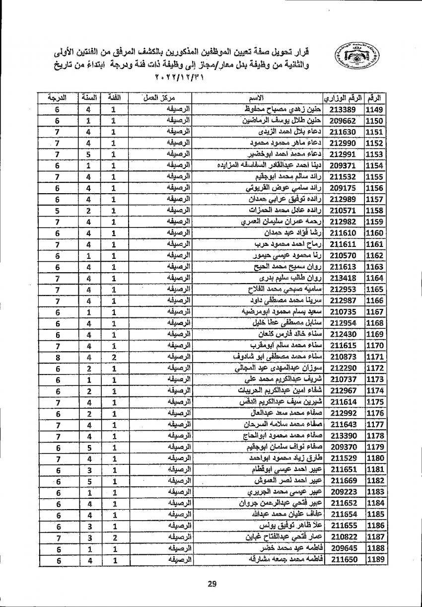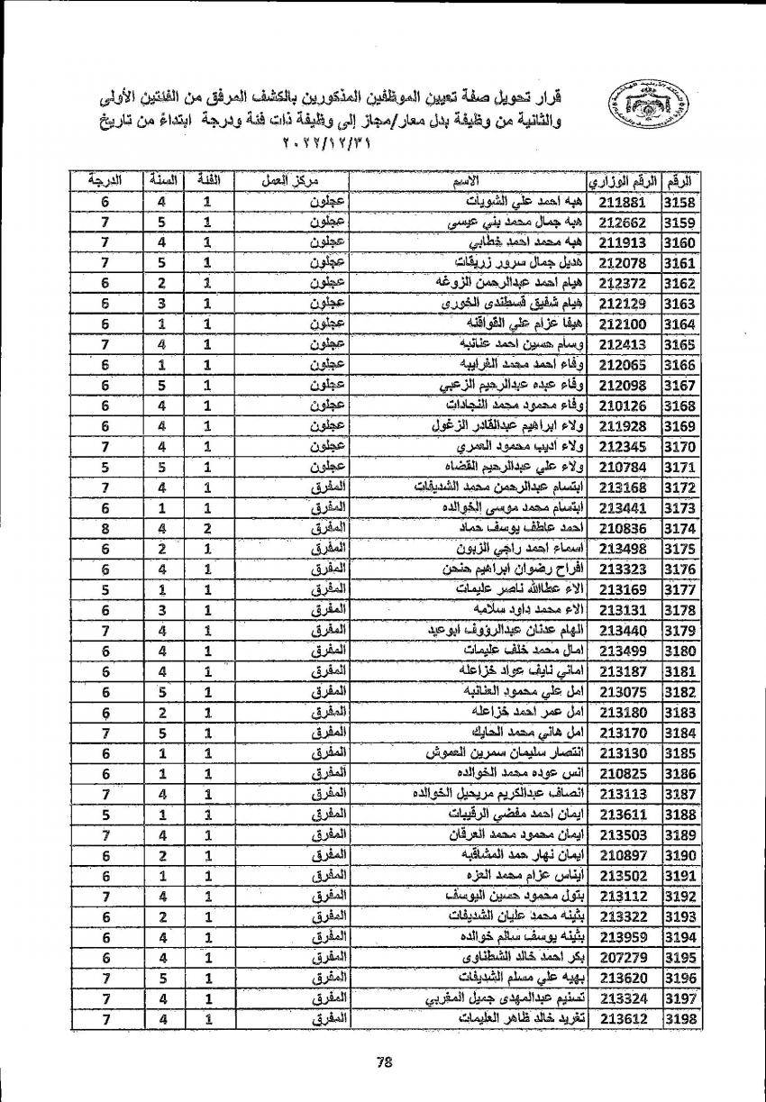ووفق التعميم، قرر الوزير تعيين المذكورين في الكشف المرفق أدناه في ملاك وزارة التربية والتعليم بعقود وظائف ذات فئات ودرجات للفئتين الأولى والثانية براتب السنة والدرجة المبينين إزاء اسم كل منهم، ابتداء من تاريخ 31/12/2022