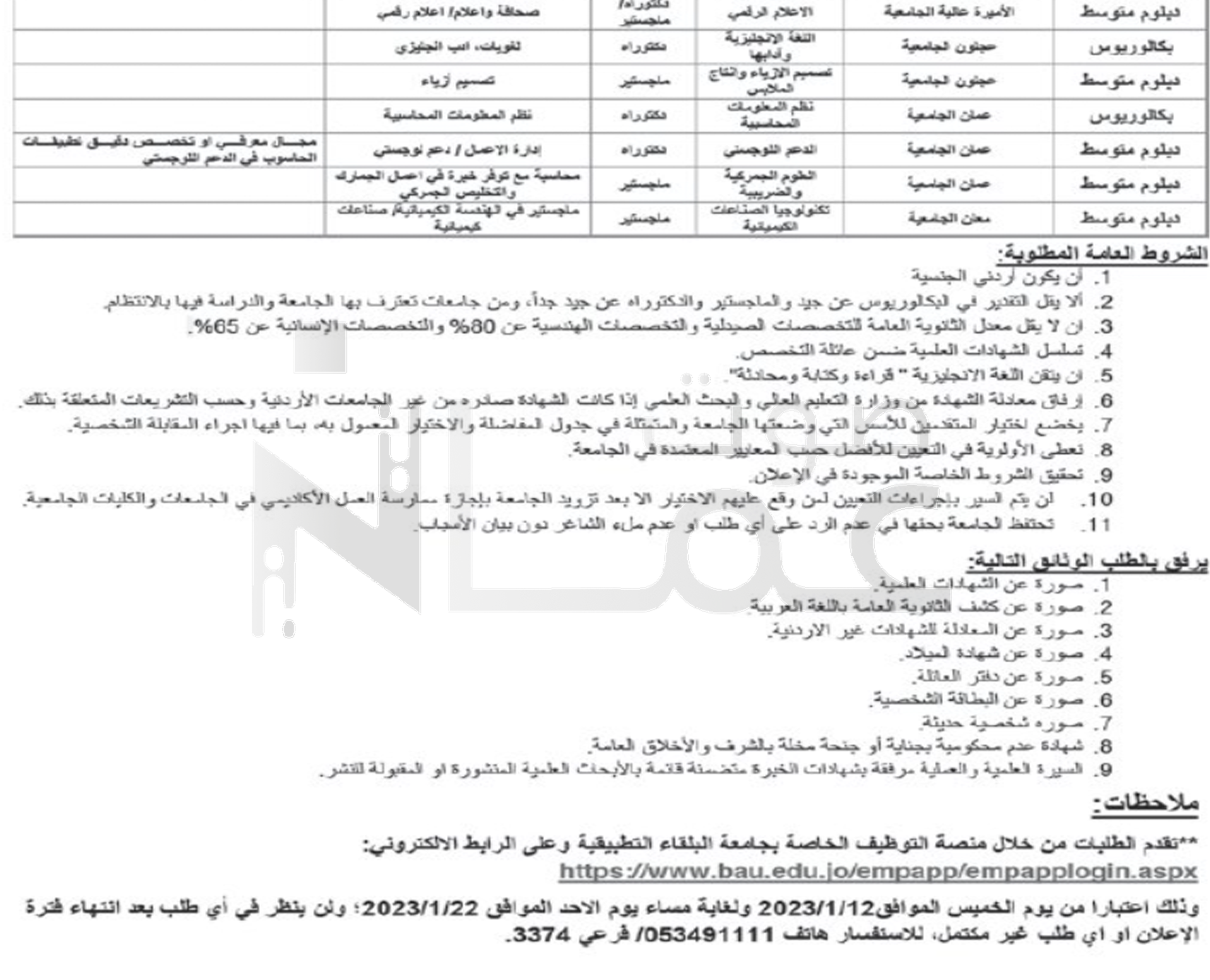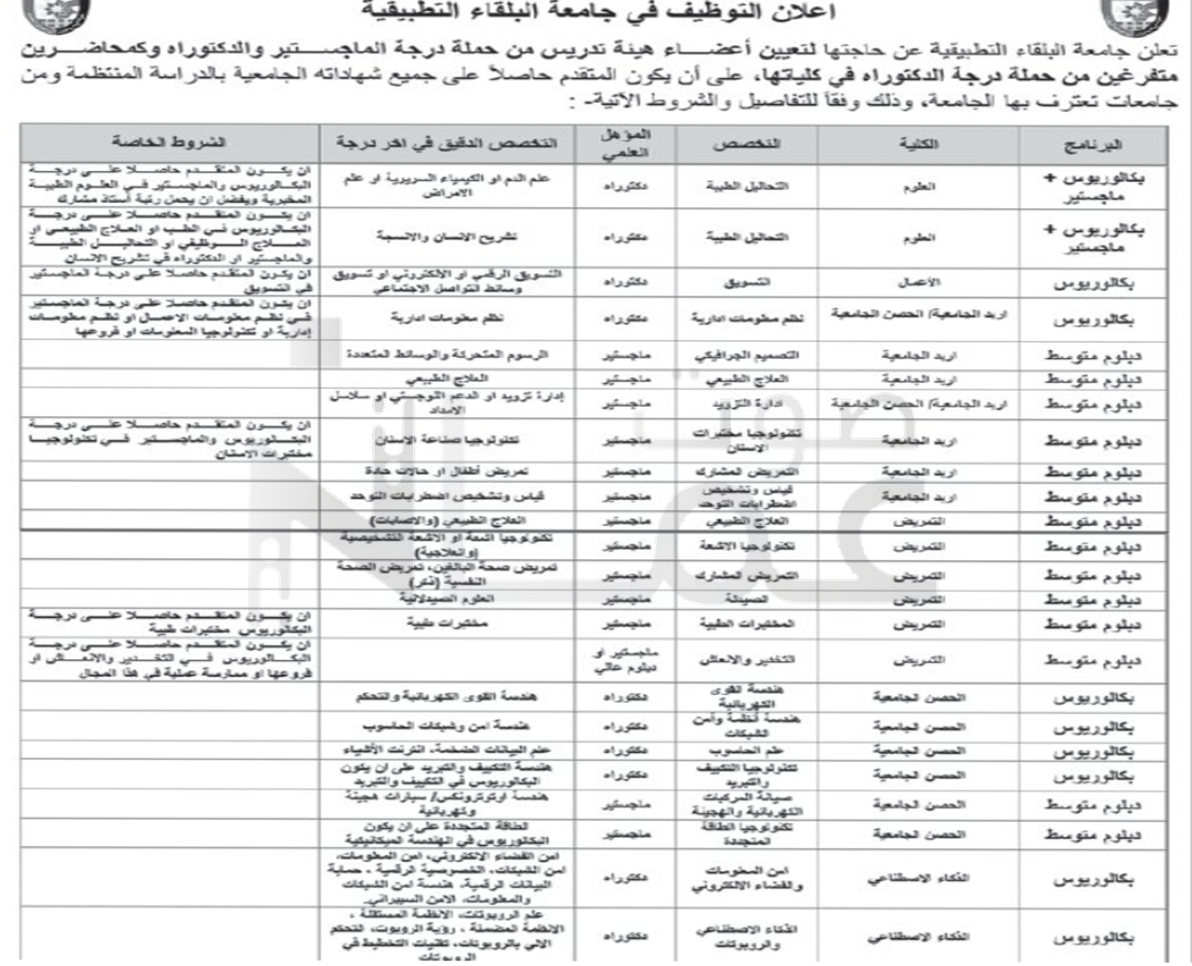 أعلنت جامعة البلقاء التطبيقية عن حاجتها لتعيين أعضاء هيئة تدريس من حملة درجة الماجستير والدكتوراه وكمحاضرين ومتفرغين من حملة درجة الدكتواره في كلياتها.